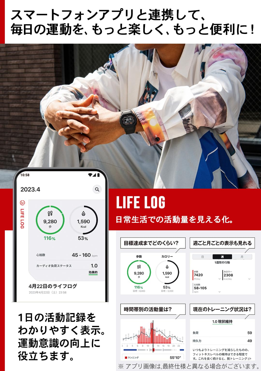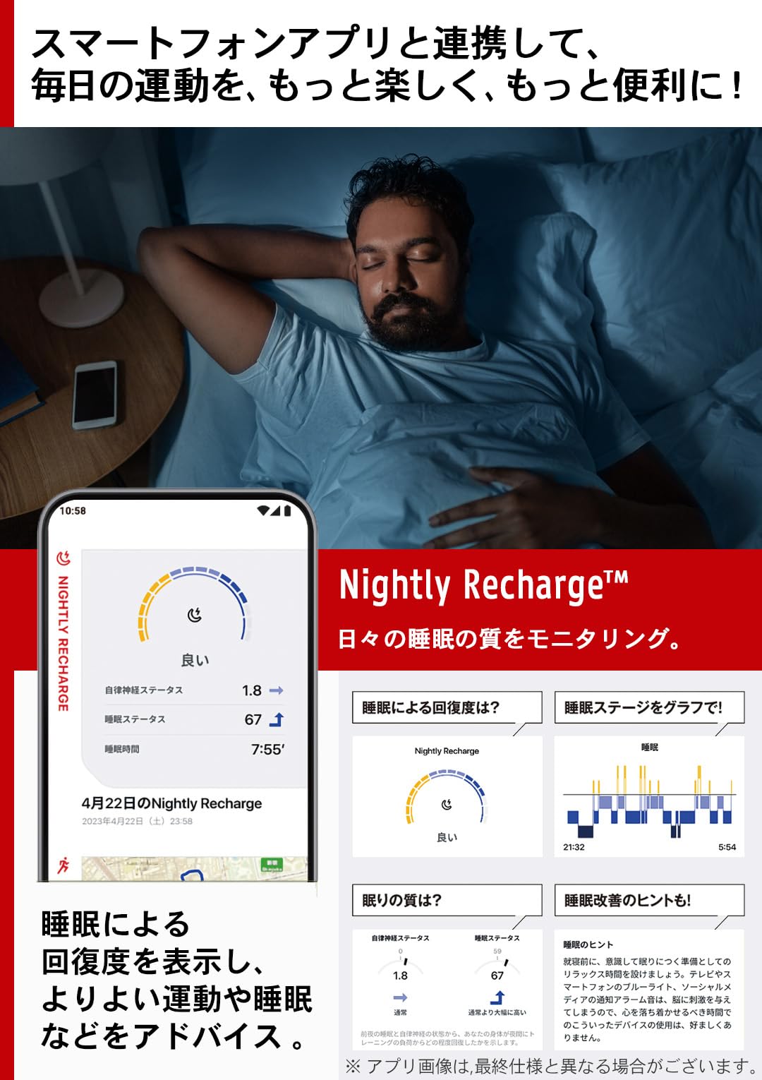 [Training / sleep analysis] Training analysis by Polar library and sleeping degree of recovery can be analyzed. It also has a blood oxygen level measurement function.