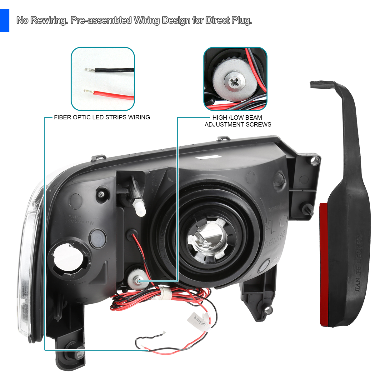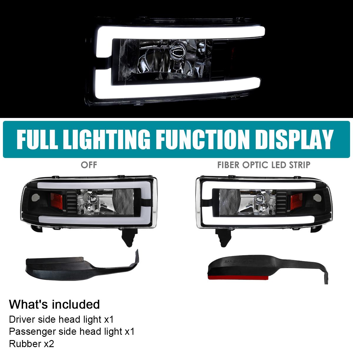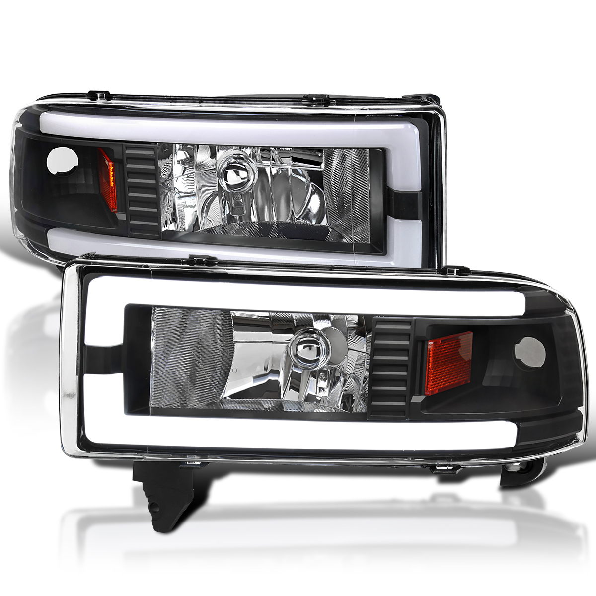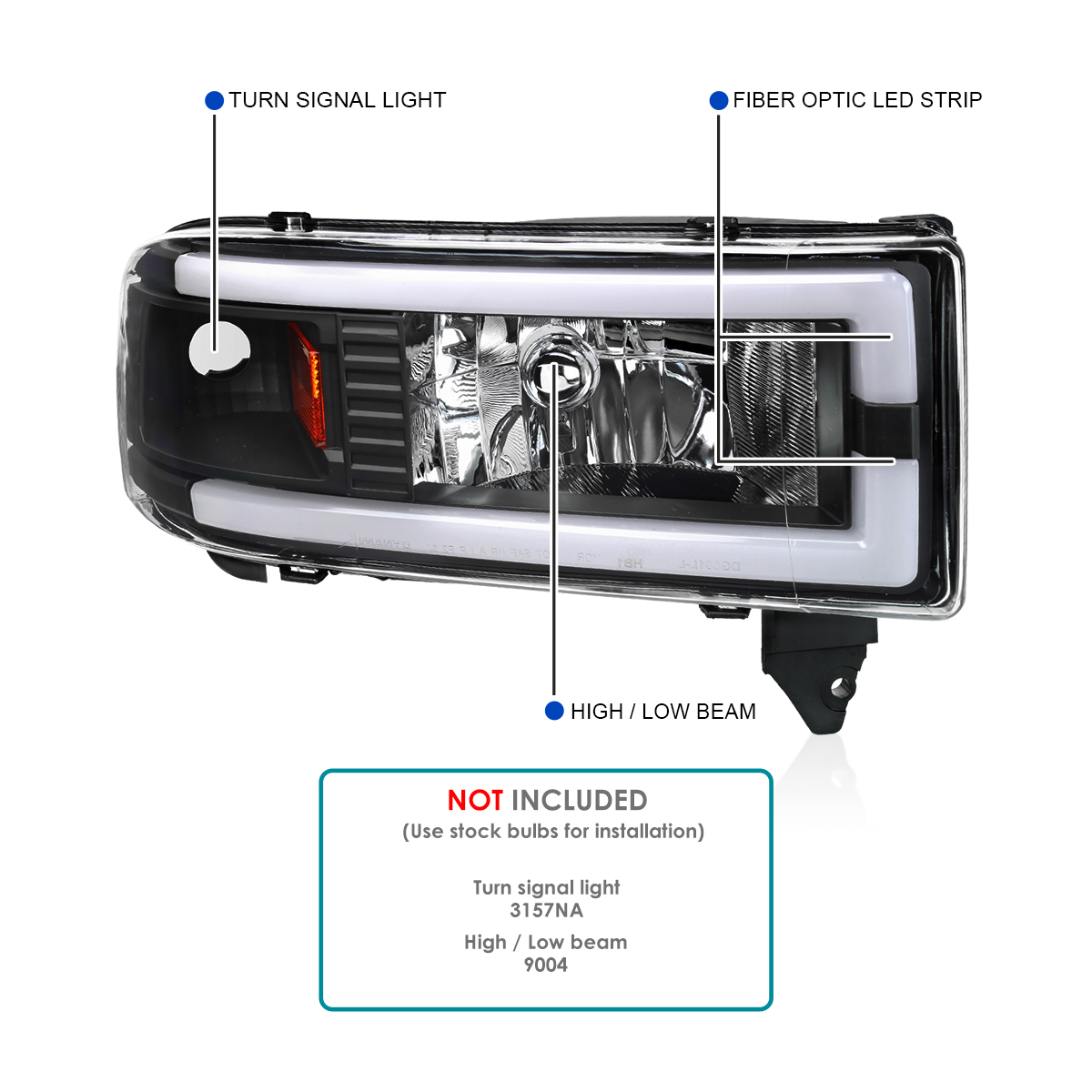 DESCRIPTION: Brand new in original box. Comes with 1 pair of driver and passenger side black housing clear lens headlights with amber reflector and fiber optic LED strips/bars. Bulbs are not included. Made by an ISO certified manufacturer using materials that meet strict OEM requirements. Professional installation is highly recommended.