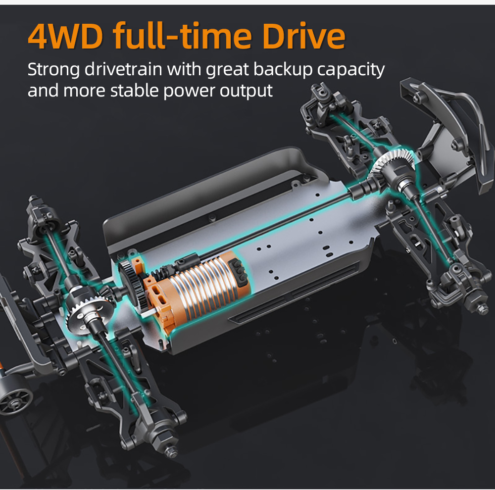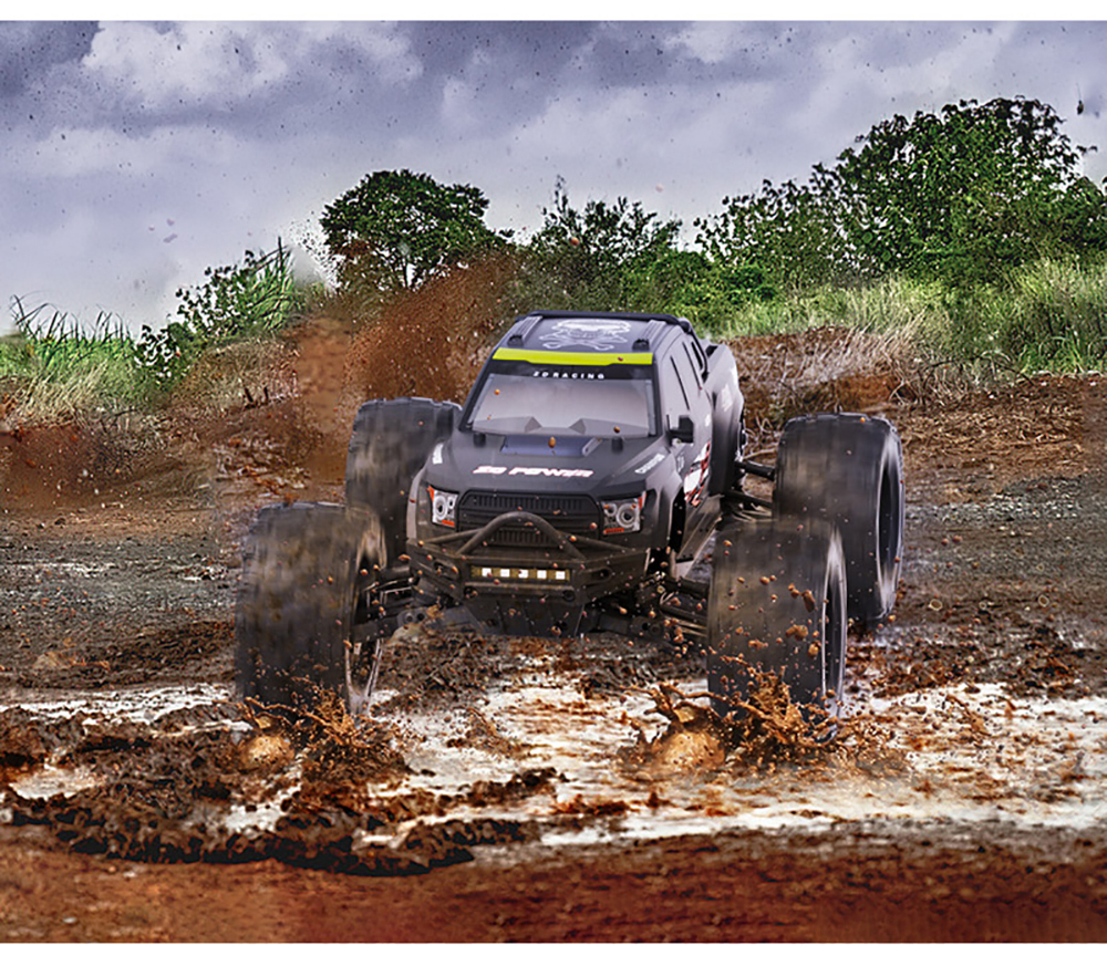 MT-16 4WD RC Car equipped with Rocket 2845 brushless motor 3600KV, 2.2kg full waterproof metal gears servo, 3 35C 2200mAh battery, 2.4G 4CH transmitter, the RC car speed is up to 80km/h and can deal with all kinds of rough roads like sands, meadow, gravel.