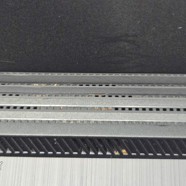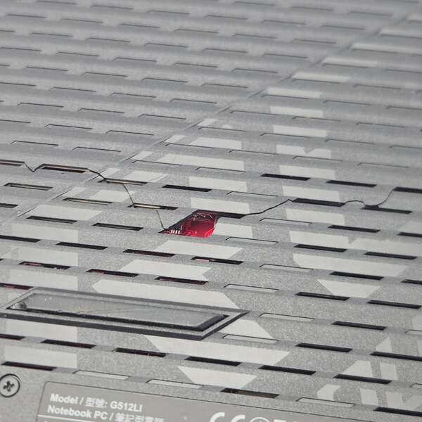 Bottom casing has cracks, please see photo of bottom for detail. Some vents and hinge have minor dust/debris that does not affect functionality.