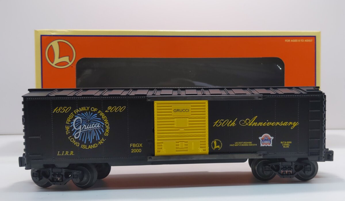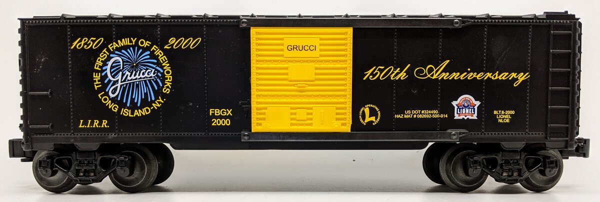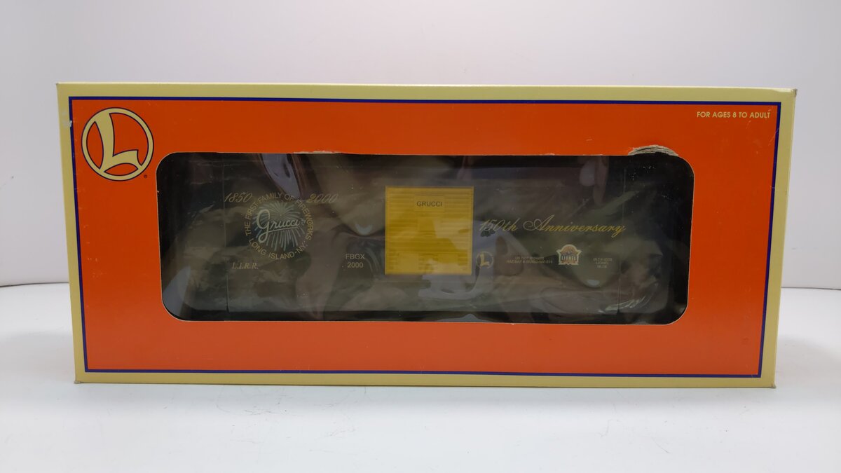 Here is a Lionel 6-52186 O Gauge NLOE GRUCCI 150th Year Anniversary Boxcar. The words -Grucci 150th Anniversary 1850-200 The First Family of Fireworks Long Island NY- are printed on the side. This boxcar features a durable plastic construction with sliding doors, die-cast metal sprung trucks, metal wheels and axles, and operating knuckle couplers.