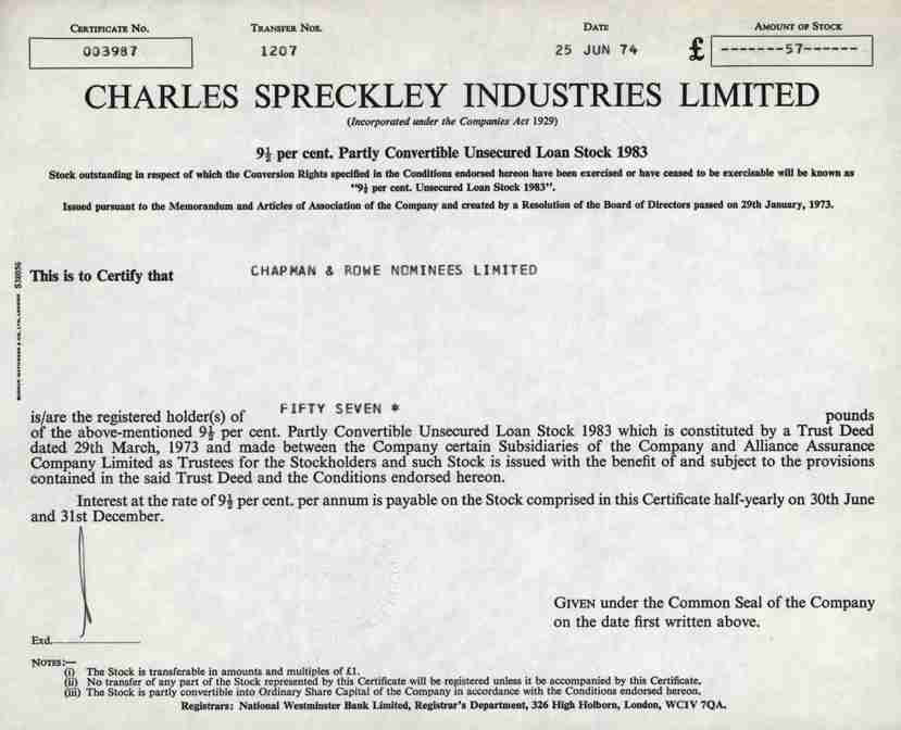EINZELSTÜCK aus dem Jahr 1983 !!! Orginalaktie -- siehe Bild -- über 57 Aktien (Loan Stock) der Charles Spreckley Industries Limited vom 25. Juni 1974. Die Gründung erfolgte bereits 1929. Herstellung von medizinischen Artileln. Papier, leichte Mittelfalten, in guter Erhaltung: VF+. Sammlerfreundlicher Sonderpreis # !!!
