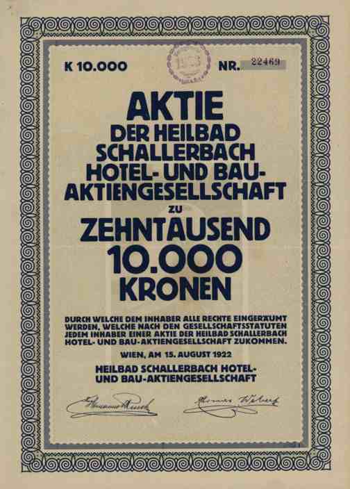 TOP Hotel Gründeraktie aus Bad Schallerbach selten ###### Großquerformatige Gründeraktie -- siehe Bild -- über 10.000 Kronen der Heilbad Schallerbach Hotel und Bau AG, Wien im August 1922. Bad Schallerbach ist eine Marktgemeinde in Oberösterreich im Bezirk Grieskirchen. Die Schwefelthermalquelle wurde 1918 erschlossen. Die Gründung erfolgte zum 15. 8. 1922 als Heilbad Schallerbach Hotel- und Bau AG. Im Dezember Umfirmierung in Bad Schallerbach Hotel und Bau AG. Die Gesellschaft baute in Schallerbach das Kurhotel Bellevue. 1. Bild zeigt das Hotel um 1930 - wird nicht mitgeliefert !!! Kräftiger Doppelblattbogen mit Talon - Dividendenschein Nr. 7 bis 20 anbei. Papier in guter Erhaltung: EF. Übergröße: ca. 347 x 246 mm. --- Sonderversand ungeknickt im stabilen Hartkarton nur 6,00 Euro (Inland) -- Weltweit: 8,00 Euro. Papier, ungelocht, leichte Mittelfalte in guter Erhaltung: VF+. Extra grosser SCAN -- sehen SIE selbst !!! Sammlerfreundlicher Sonderpreis !
