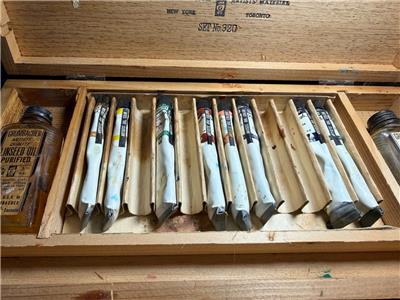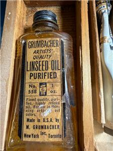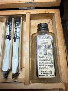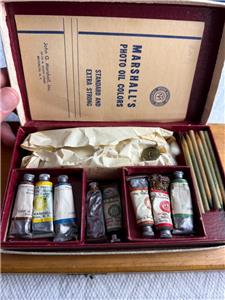 This is a lot of paints. The larger box is made of wood and marked GAINSBOROUGH Artists Oil Colors by M. GRUMBACHER. There are 9 tubes. There is a cardboard box of Marshall's. Those are smaller tubes and there are 8 of those too. All would be partially used. I don't know if this is stuff is good or not.