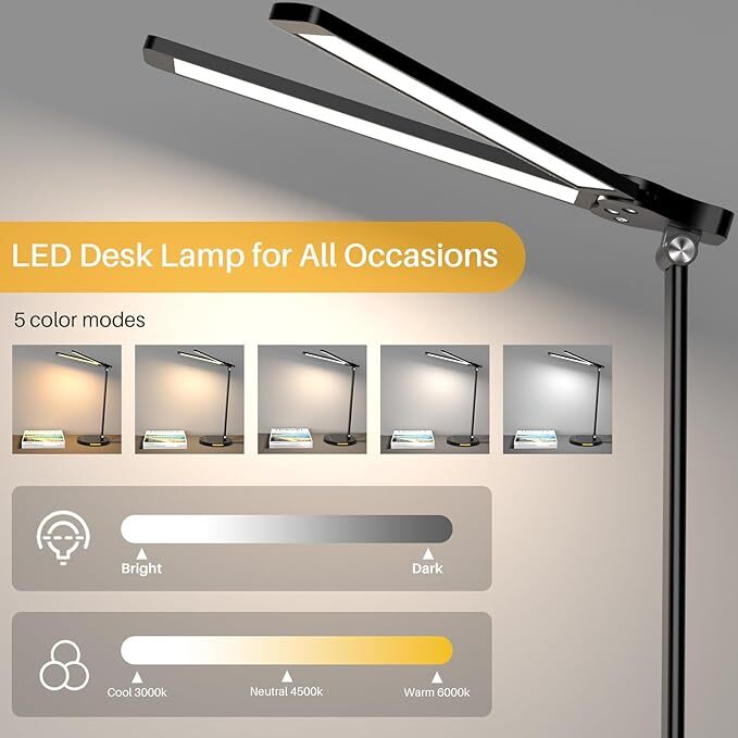 【Touch Dimmable Desk Lamp】 Explore the 5 light colors and 5 brightness levels of the LED desk lamp by touch. From 3000K warm light to 6000K white light. Mix brightness and color according to your preference for work, art or study. The desk lamp will remember your choice for next use