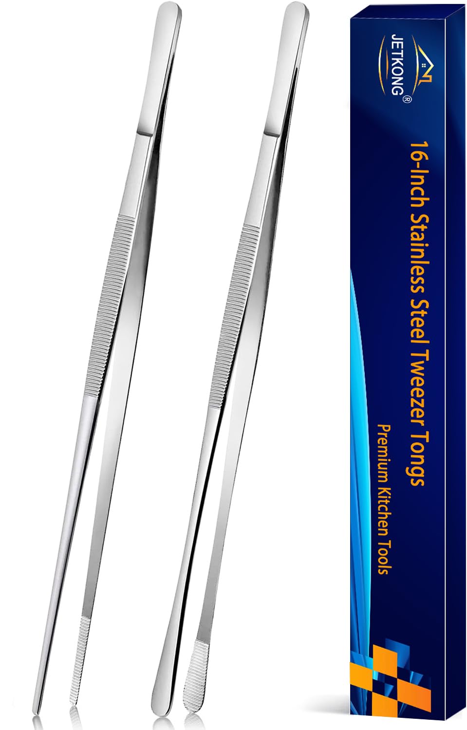 JETKONG 2 Pcs 16'' Tweezer Tongs, Extra Large Food Tweezers, Extra Long Kitchen Tweezers for Cooking Repairing and BBQ (16-Inch, Silver)