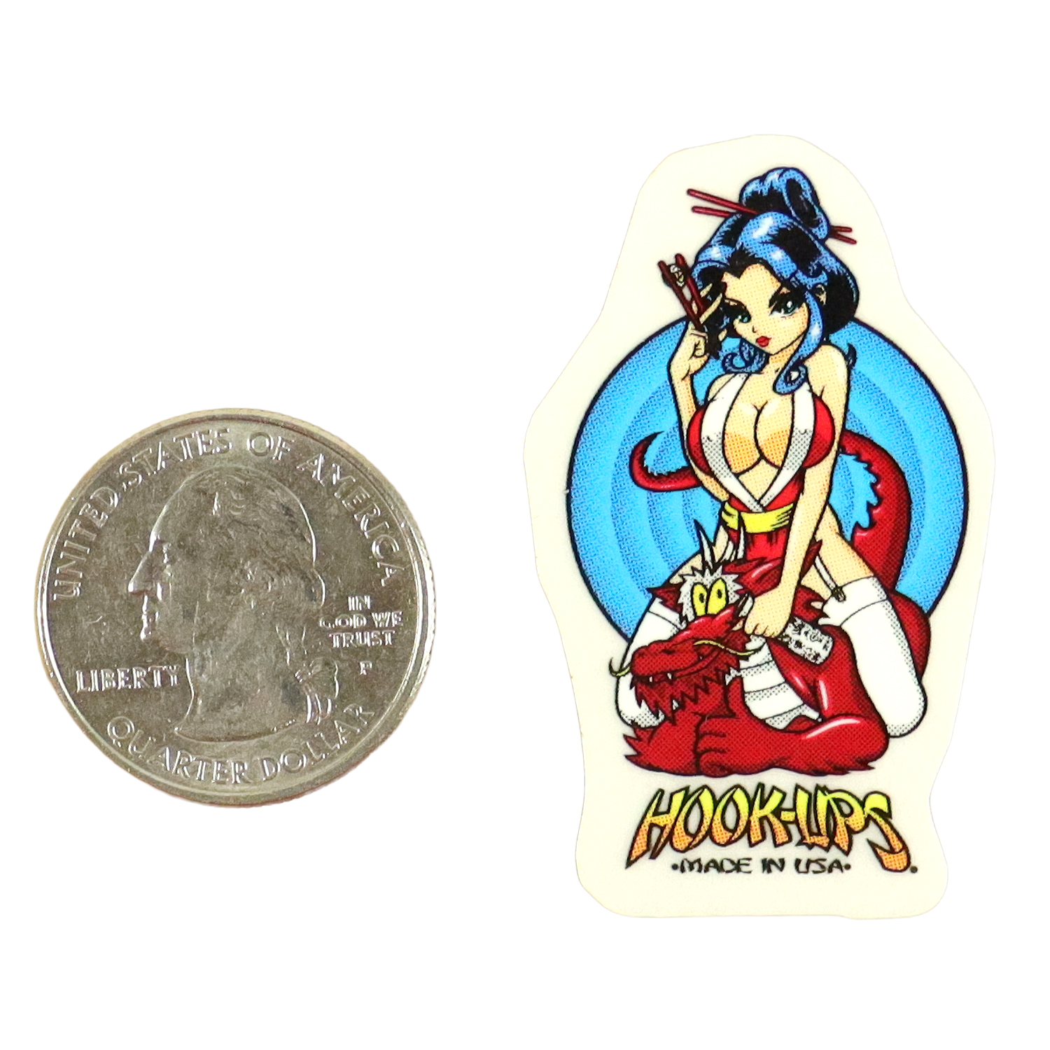 *Please note the size of this sticker* Quarter for scale, NOT INCLUDED. Premium quality mini size sticker from Hook Ups Skateboards. Perfect for phones, dashboards, laptops, etc.