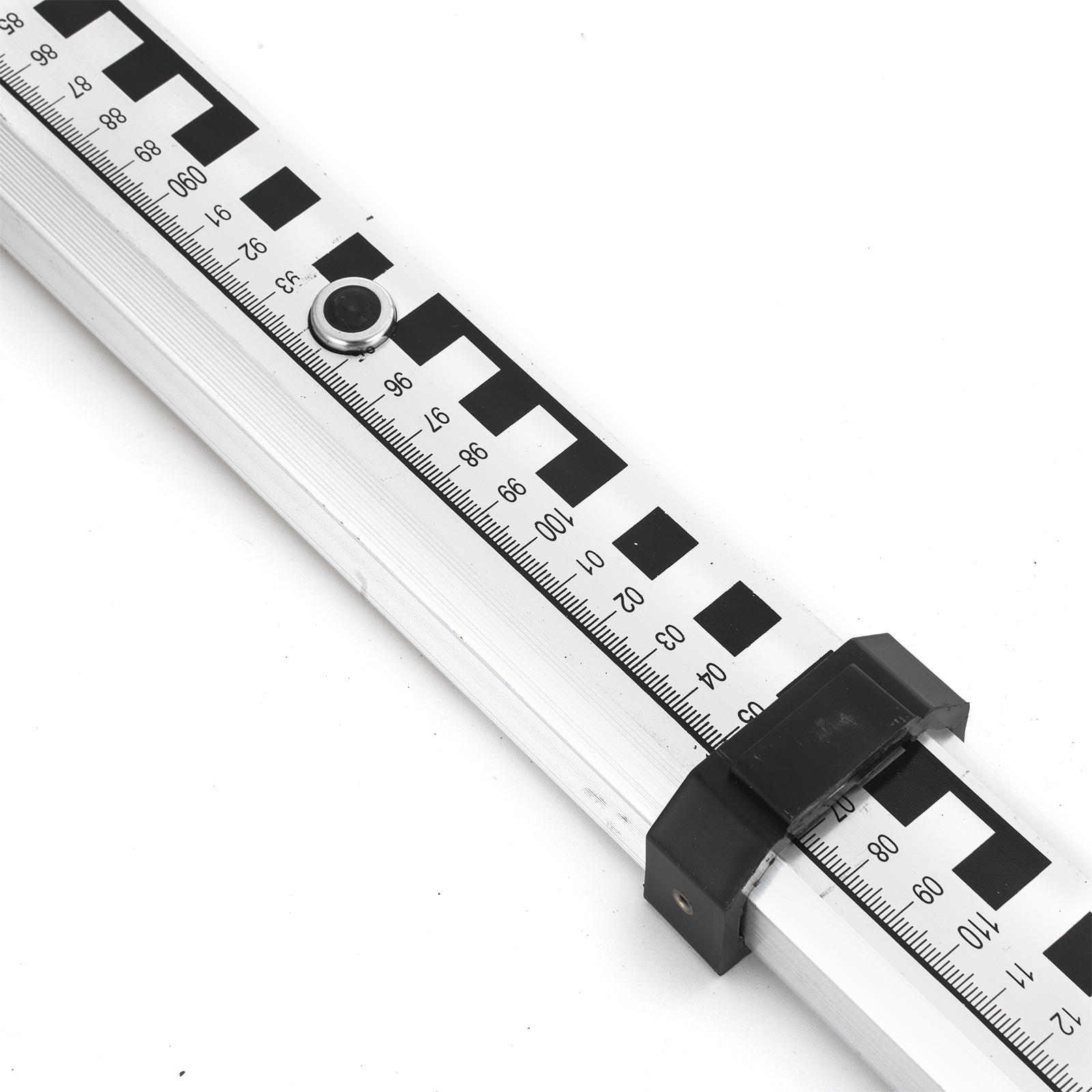 It's great for auto-level, transit, construction laser-level. Lightweight, durable aluminum material with 5 telescopic sections. Insert the bladder to adjust the height. Bar scale on the back for quick height measurements. The scales are metric, quick release, 165 cm open, 104 cm closed. And a strong carrying bag included.