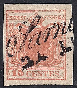 LOMBARDO VENETO 1851 - 15 Cent. ROSA CARNICINO, II TIPO, PERFETTO USATO A SARNICO, FRESCO E MOLTO BELLO. FIRMATO FERRARIO. CATALOGO SASSONE n. 5c + punti 10 € 637,00.
