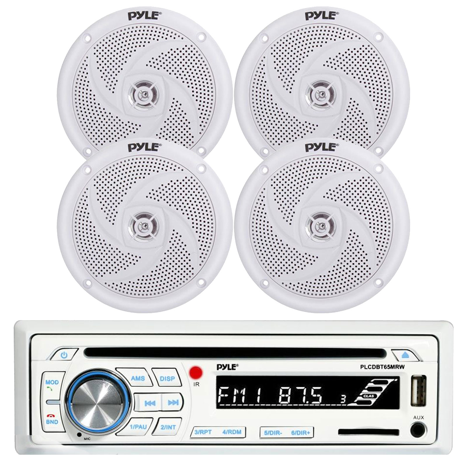 Pyle Single DIN Marine USB Bluetooth Stereo Receiver with Pyle 4" White Speakers