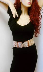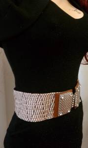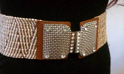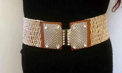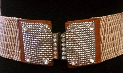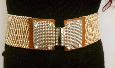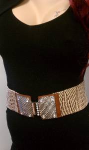 WOMEN BROWN & CREAM WAIST FASHION ELASTIC BELT RHINESTONE BUCKLE SIZES S M L XL
