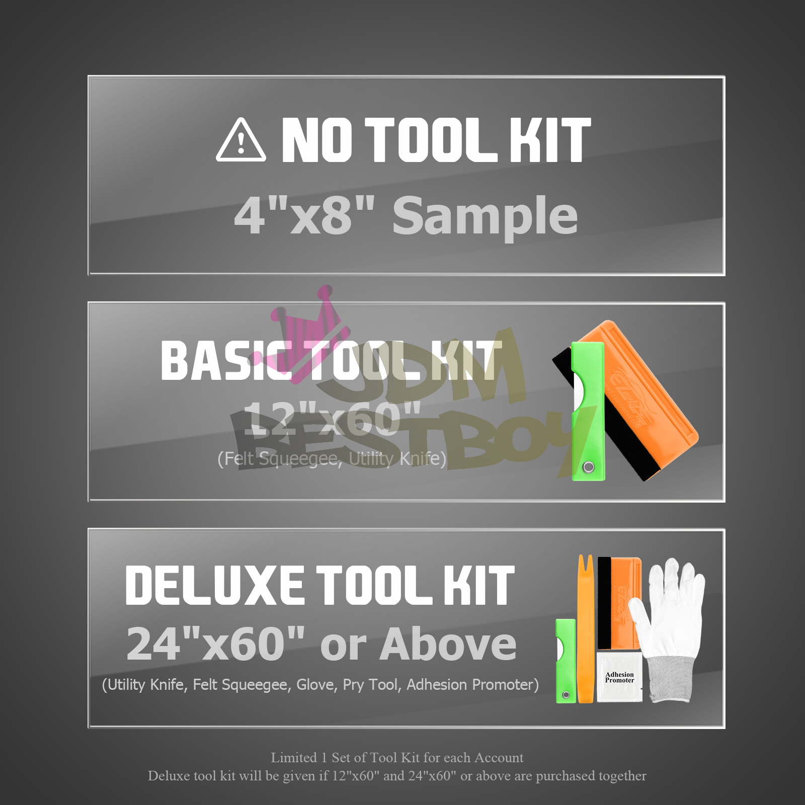 Deluxe tool kit will be given if 12"x60" and 24"x60" or above are purchased together