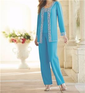 The sale for an elegant beaded pant set with tuxedo rich beaded trim. Silvertone beads lend pure glamour to the jacket and tank. Tank has a djustable strap. Pants and tank are lined. Pant has back elastic waist, side zipper about 7"and closure. 3-piece pant set. Its rich turquoise hue is enhanced by the beaded trim on duster jacket and tank. Pant has back elastic. 32" inseam. Polyester; dry clean. Imported. Available in turquoise only.