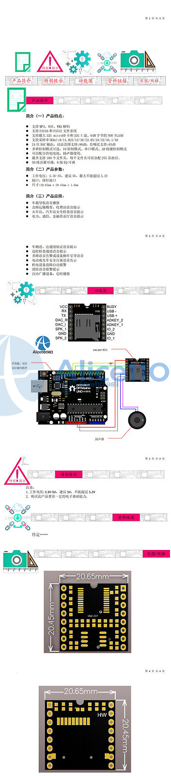 DFPlayer Mini is a compact and inexpensive MP3 module can be connected directly to the speaker. Module with battery power supply, speaker, keypad can be used alone, or through the serial port control, as the Arduino UNO or any microcontroller with a serial port module. The module itself perfectly integrated hardware decode MP3, WAV, WMA's. While the software supports TF card driver to support FAT16, FAT32 file system. Can be done by simple serial command plays the specified music, as well as how to play music and other functions, without tedious low-level, easy to use, stable and reliable.