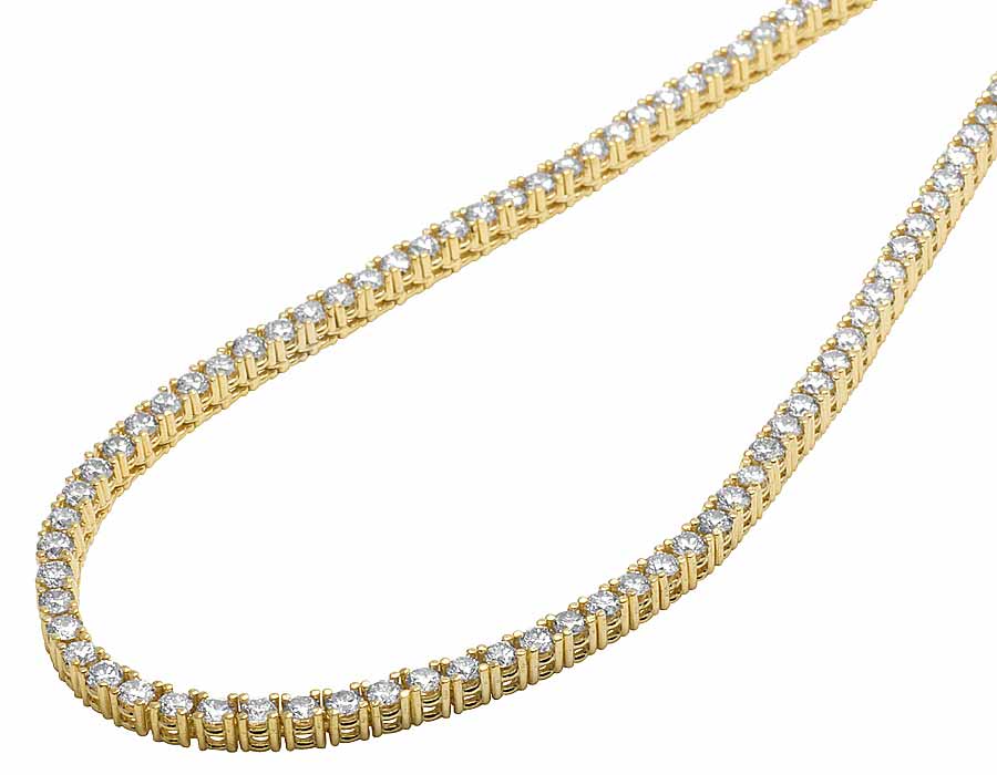 New to our collection, this chain has a well built frame to withstand daily wear. This luxurious piece of fine jewelry is made in 10K Yellow gold. A solid mounting weighing a total of 41 grams. Chain is 3 MM wide throughout. Each diamond is set in 4 prong setting, which allows it to be the focal point of the chain. The four prong setting brings forth a consistent look and when the chain sits on the neck. This chain counts approximately 188 diamonds. The diamonds are of matching clarity of VS2-S1 with G-H color rank. Each stone is Fully Faceted Round Brilliant Cut diamond. A total of 22.25ct of diamonds are set on this necklace.