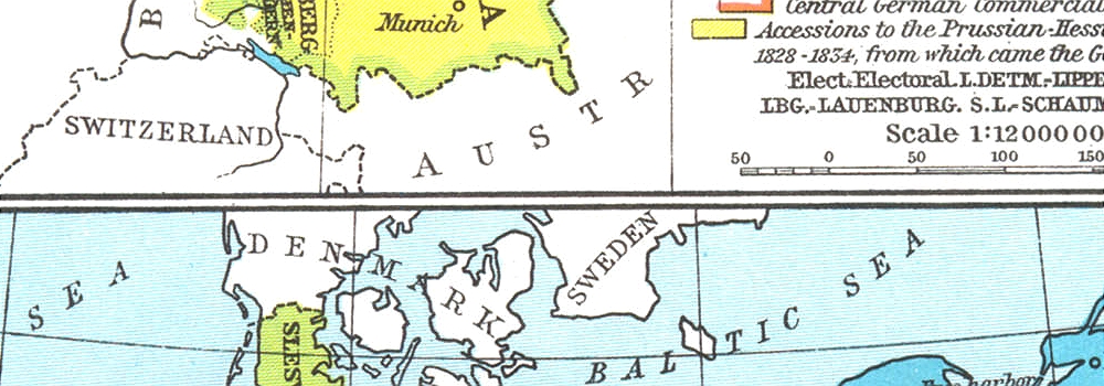 Title of map: 'The German "Zollverein" (Customs-Union), 1828-1872: I. 1828-1834; II. After 1834'