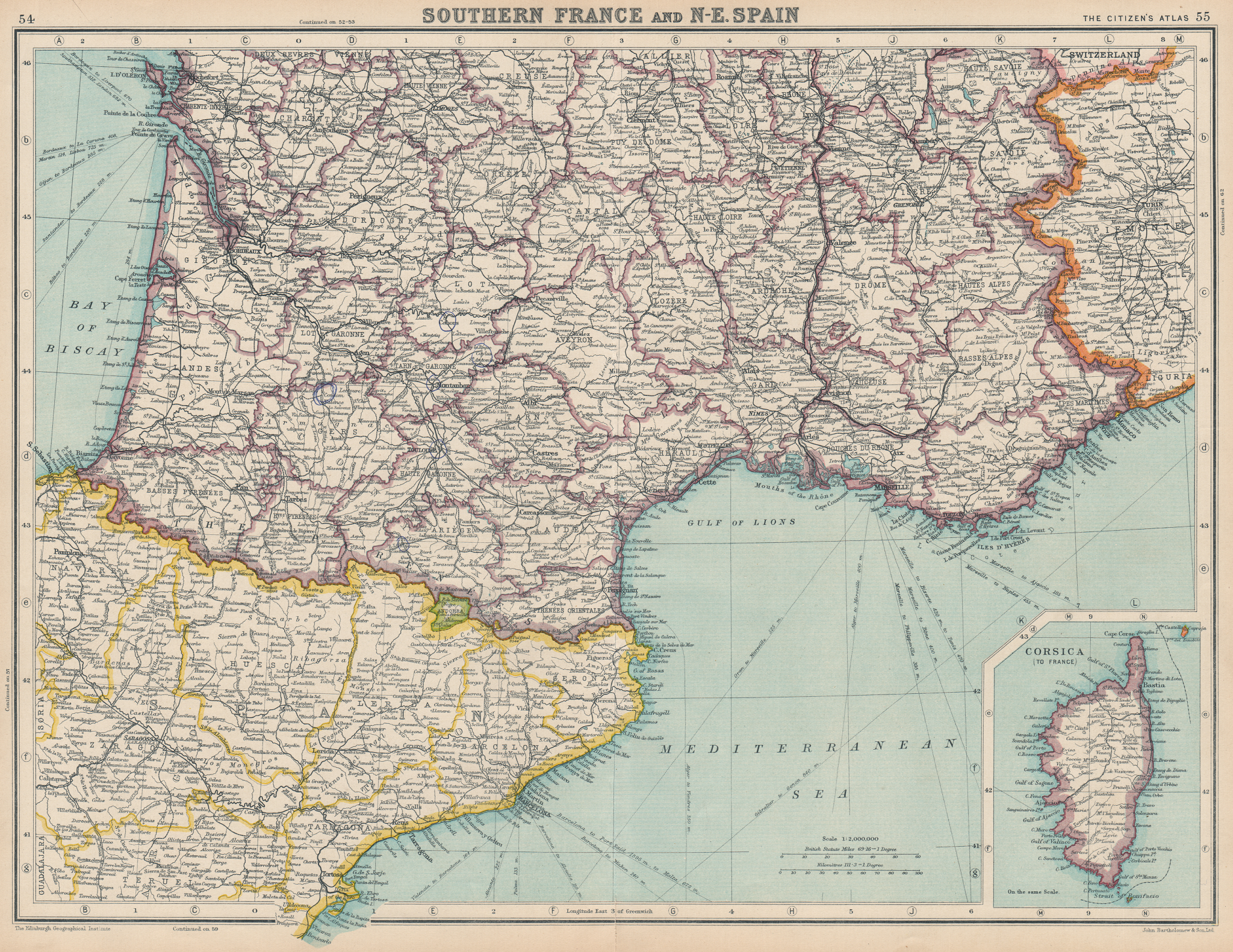 Title of map: 'Southern France and N-E. Spain; Inset map of Corsica (To France)'