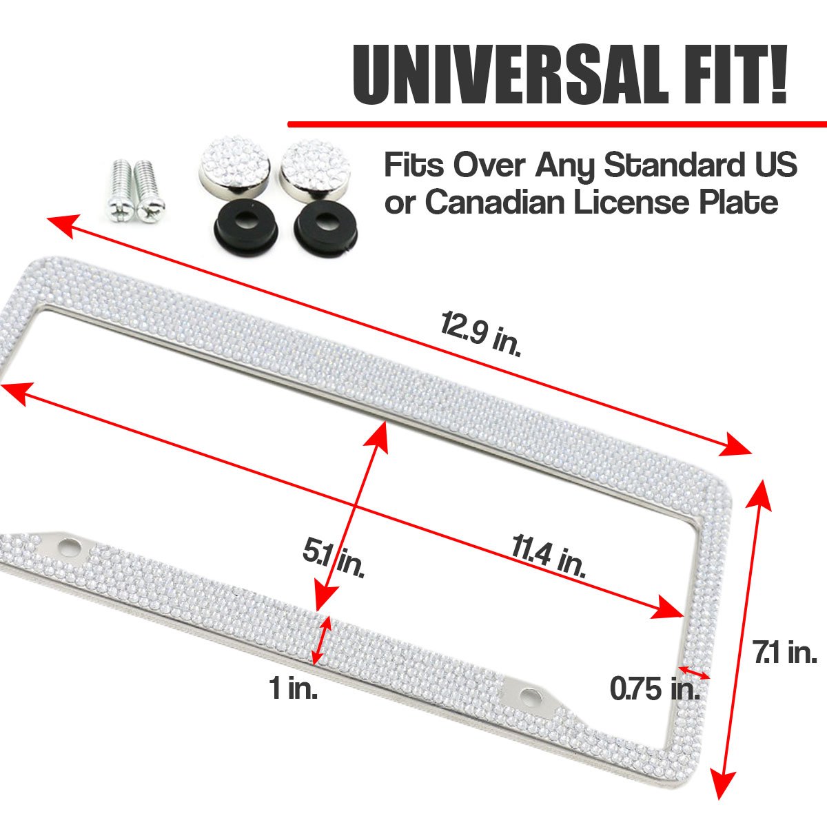 ► The crystal bling is designed to fit most standard size U.S. license plate which is 6 by 12 inches. The frame is 12.9 inches in length and 7.1 inches in height. This bling license plate frame is virtually with optimum resistance to weathering. The whole frame is consists hundreds of shiny crystals. The bottom of the frame has a full 8 rows of shiny bling.