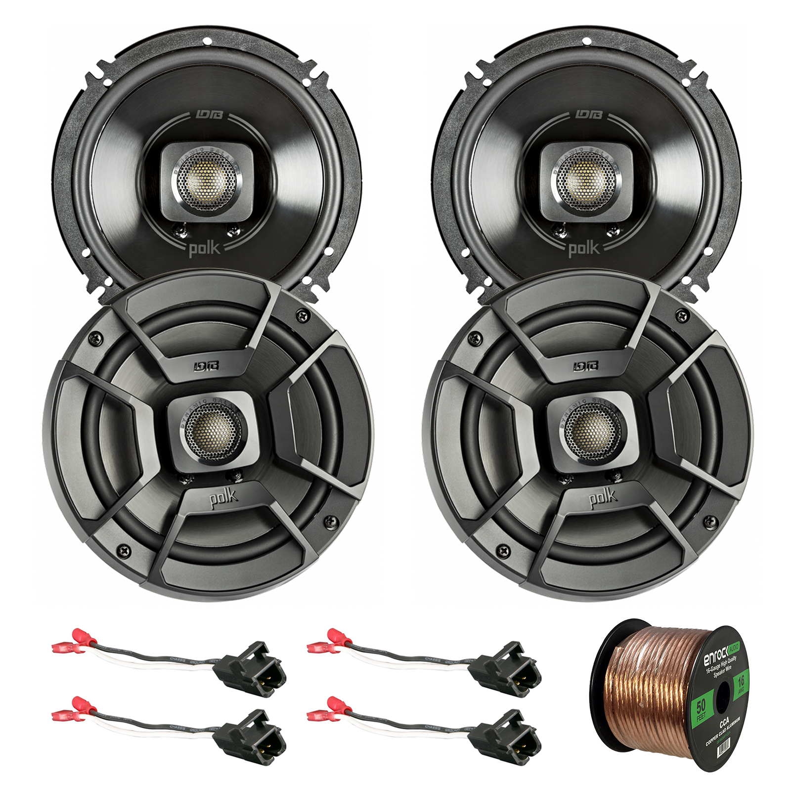 • PACKAGE INCLUDES: 4 x Polk Audio 6.5" 300W 2 Way Car/Marine ATV Stereo Coaxial Speakers DB652, 4 x Metra 72-4568 Speaker Wire Harness for Select GM Vehicles, 1 x Enrock Audio 16-Gauge 50 Foot Speaker Wire