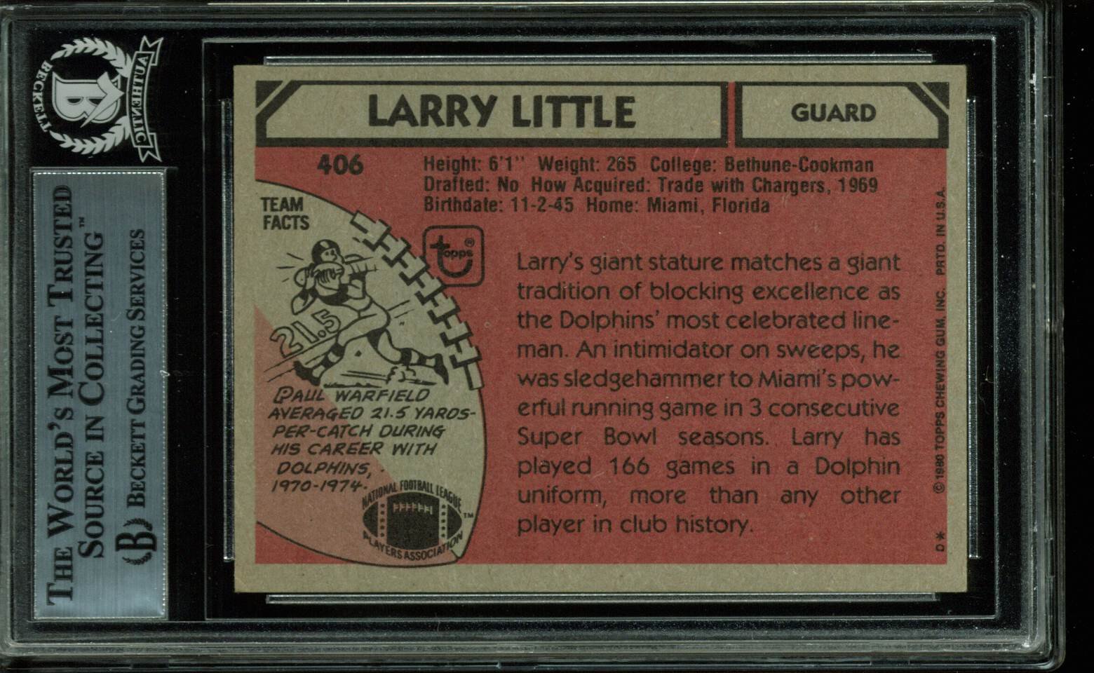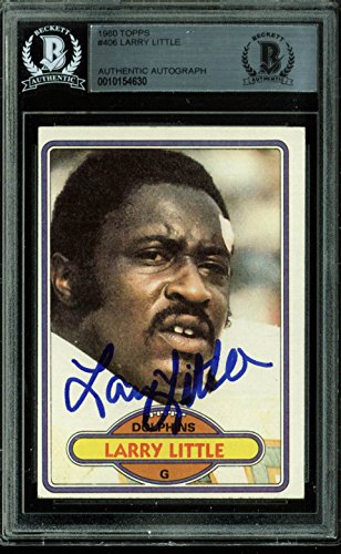 This is a 1980 Topps #406 Authentic Signed Card that has been Personally Signed & Autographed by Larry Little of the Miami Dolphins. This item is 100% Authentc, it comes slabbed and authenticated by Beckett Authentication Services. Press Pass Collectibles offers a 100% Lifetime Guarantee on all Autographed & Signed Larry Little memorabilia.