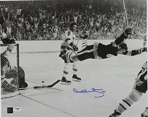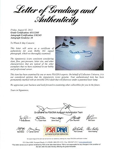 This BRUINS BOBBY ORR SIGNED 16X20 PHOTO AUTO GRADED 10! GNR HOLO/COA & PSA/DNA has been certified authentic. The autograph on this photo has been given a perfect graded of 10 by PSA/DNA. Orr scored the Stanley Cup clinching goal in overtime on May 10, 1970 against the Blues. It will include the PSA/DNA numbered hologram and matching Certificate of Authenticity. It also authenticated by Great North Road, the company who has the exclusive to Bobby Orr. It will include their numbered hologram and matching Certificate of Authenticity. This is a stock item, we have several of these available. The one you will receive will be of equal quality to the one pictured. This item is in great condition and your satisfaction is guaranteed.