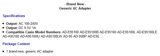 Casio CTK-2550 digital piano keyboard power supply ac adapter cord cable charger Store Inventory Reference Number: NFU-84NWS-9901Store Shipping Code: PACK-569