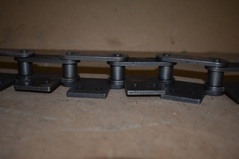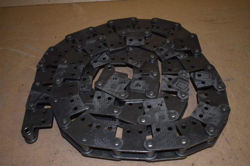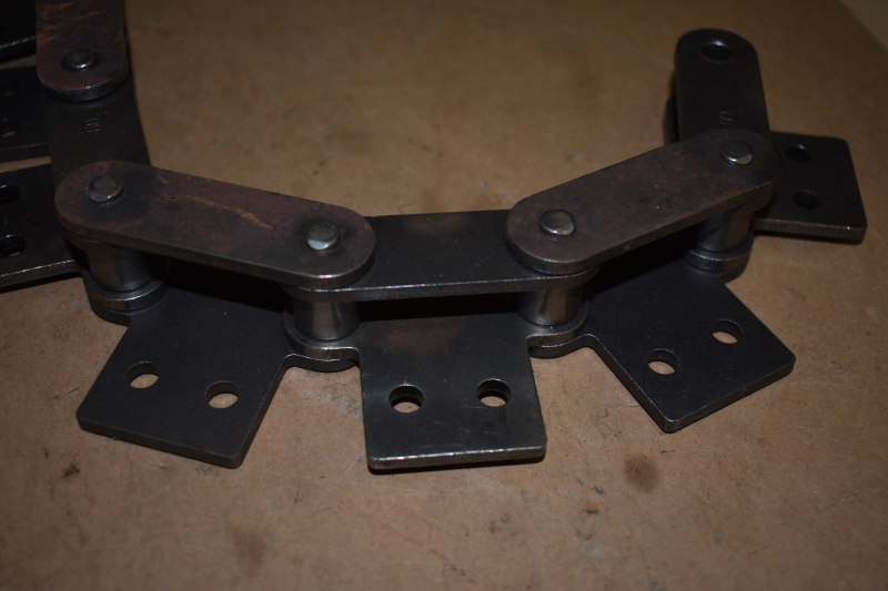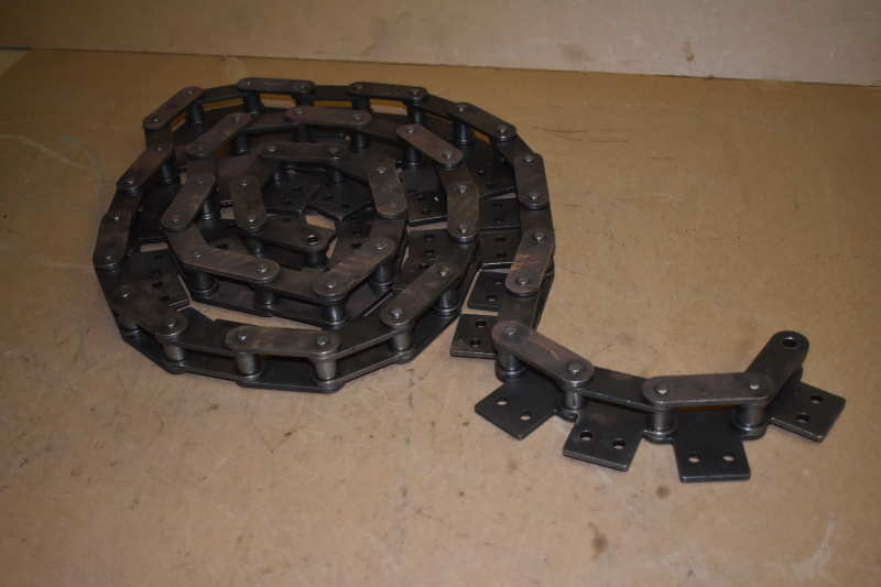 This is an unused double pitch roller chain type C2080, we do not know the manufacturer. The connecting links are stamped "60"