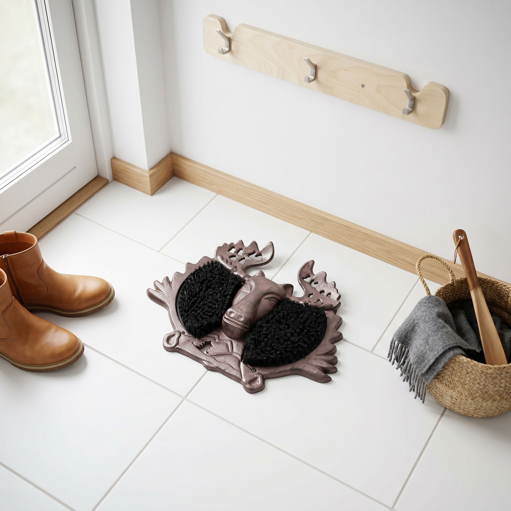 Le tapis à chaussures « Elk » allie fonctionnalité pratique et charme rustique et constitue un accessoire élégant dans un style maison de campagne classique. La tête d'élan décorative donne au grattoir à chaussures un look saisissant d'inspiration nordique et en fait un véritable accroche-regard dans l'entrée.