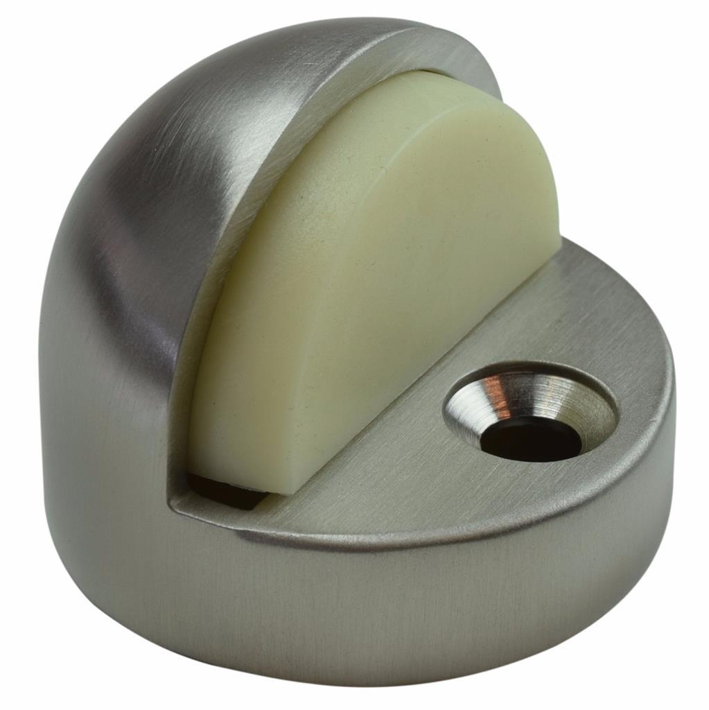 High Profile solid brass floor-mount dome door stop in satin nickel finish. Half-inch high base for high-rise doors (for doors with more than 1/2-inch clearance between bottom of door and floor). Dimensions: 1.75 inch length x 1.75 inch width x 1.5 inch height. Heavyweight solid brass construction for highest quality and long life finish. Soft rubberized stopper material provides a soft landing for your door.