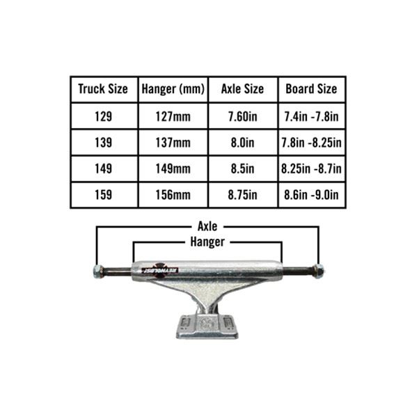 - Standard height trucks available in a variety of sizes. T6 aluminium hangers and baseplates, 4140 chromoly steel axles and grade 8 kingpins.