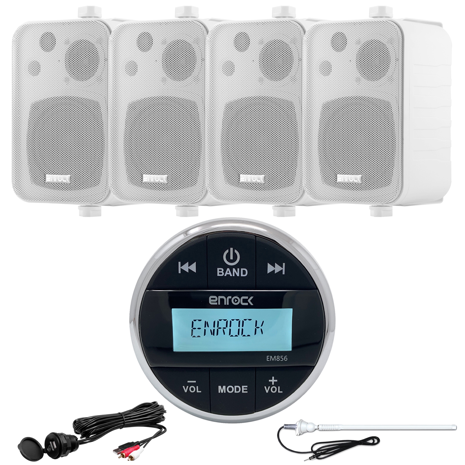 PACKAGE BUNDLE INCLUDES: Enrock EM856 Gauge Mount Media Center Marine Grade Receiver, 4 x Enrock EKMR408W Audio Systems 4" 3-Way Indoor/Outdoor Box-Speakers (White), Enrock Universal USB/3.5MM Auxiliary Interface Mount, Enrock Flexible Rubber Mast Long-Range Marine Boat/Yacht Radio Antenna (White).