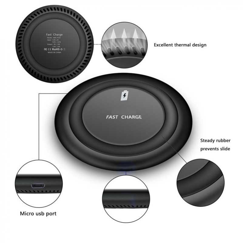 7.5W and 10W Fast Charging Ultra Slim Wireless Charger Pad Compact Adapter [Black] Non-Slip Design. Ultra Slim and Compact Wireless Charging Pad with both 7.5W and 10W Fast Charging Support. Cutting-edge Wireless inductive technology simplifies charging into just setting your phone down on the charging pad. Fast Charge Mode delivers 7.5W for iPhone and 10W for Android Phones fast wireless charge-capable device. Sleek, compact build takes up minimal space. NOTE: For Fast Charge Mode, a Quick Charge adapter must be used for the power input. Using your device while charging or misalignment of the device and charger may cause higher temperatures. Remove protective cases to ensure effective charging.