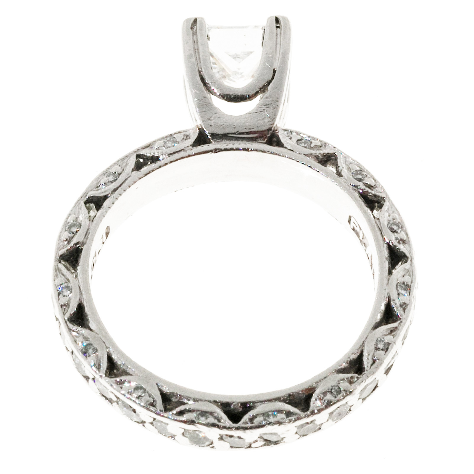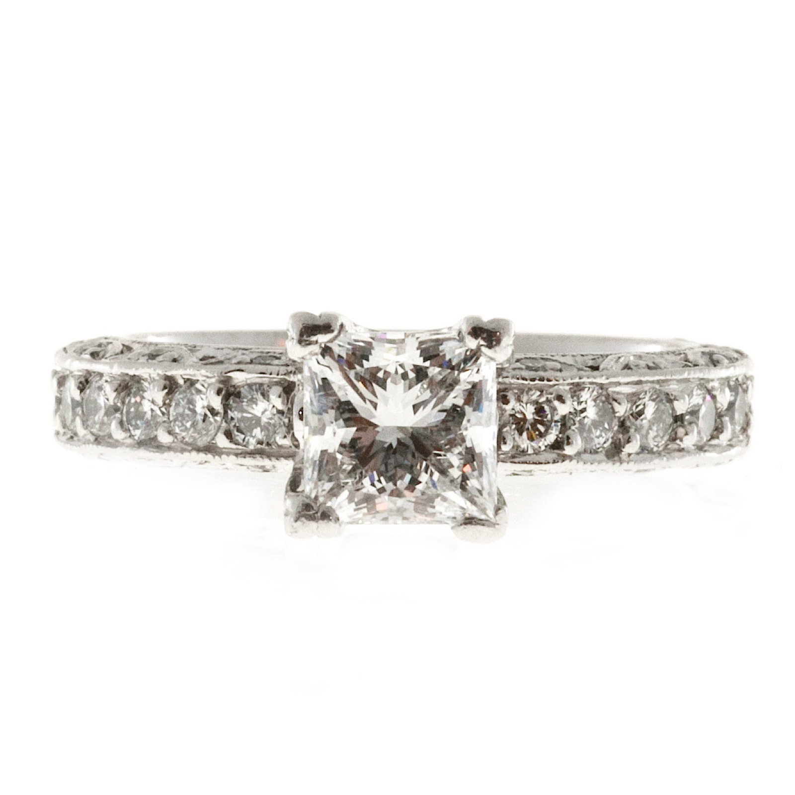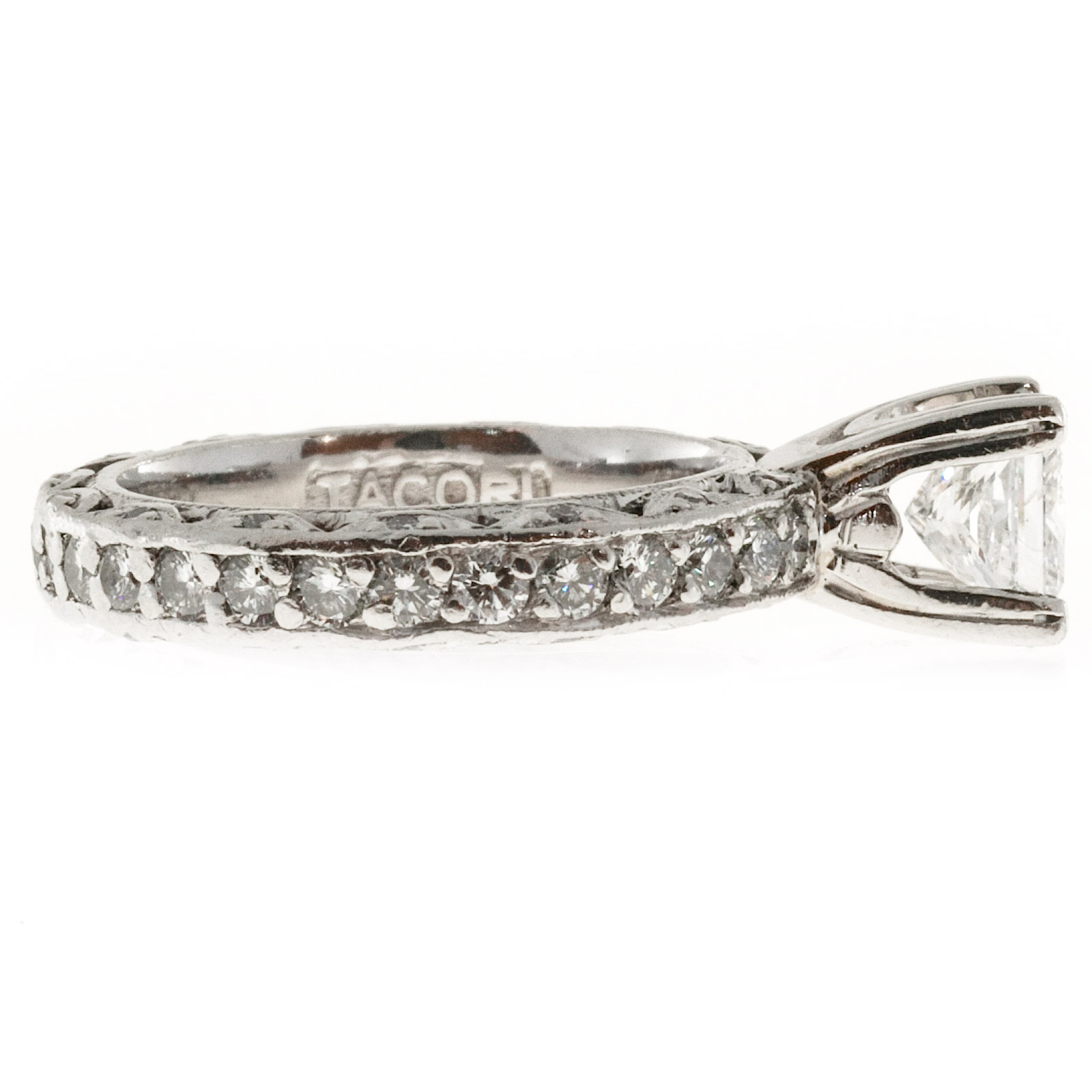 Tacori signed solid Platinum engagement ring from an estate style # HT2229A. 1.00ct total, G, VS. Tacori retails this for $6,460 for the setting. Originally purchased from Madison Jewelers, Fairfield, CT. The custom Tacori prongs are set with a beautiful well cut Princess cut diamond GIA certified #13369169 1.07ct, 5.56 x 5.55 x 4.02mm, 72.4% depth and 70% table. Excellent polish and very good symmetry. F, SI2. Totally eye clean. Beautiful ring. Not sizeable. 1 GIA certified #13369169 Princess cut diamond approx. total weight 1.07cts, F, SI2. 26 round diamonds. 28 round diamonds approx. total weight 1.00cts, G, VS. Stamped: Tacori Platinum. 7.6 grams. Width: ¼ inch. Size 5 ¼ and not sizeable. *Please see our matching Tacori band.