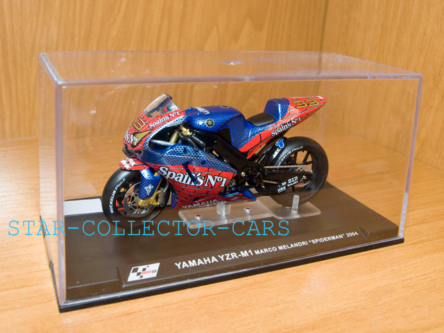 RARE scale 1:24 *YAMAHA YZR-M1 MARCO MELANDRI "SPIDERMAN" 2004 #33* . Mint condition. From the "Competition bikesMoto-GP" spanish Altaya collection. Few units made. Includes black pedestal with