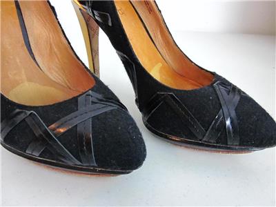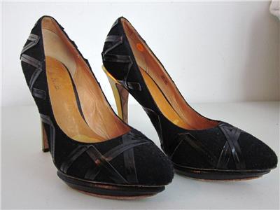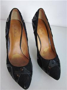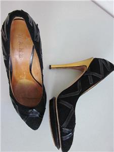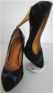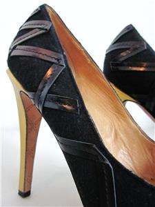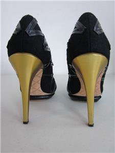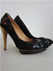 Calf Hair Material Uppers Leather Stripes Sewn In and 4.5" GOLD Spike Heels all with a Modern Geometric Design Platform Shoe from L.A.M.B