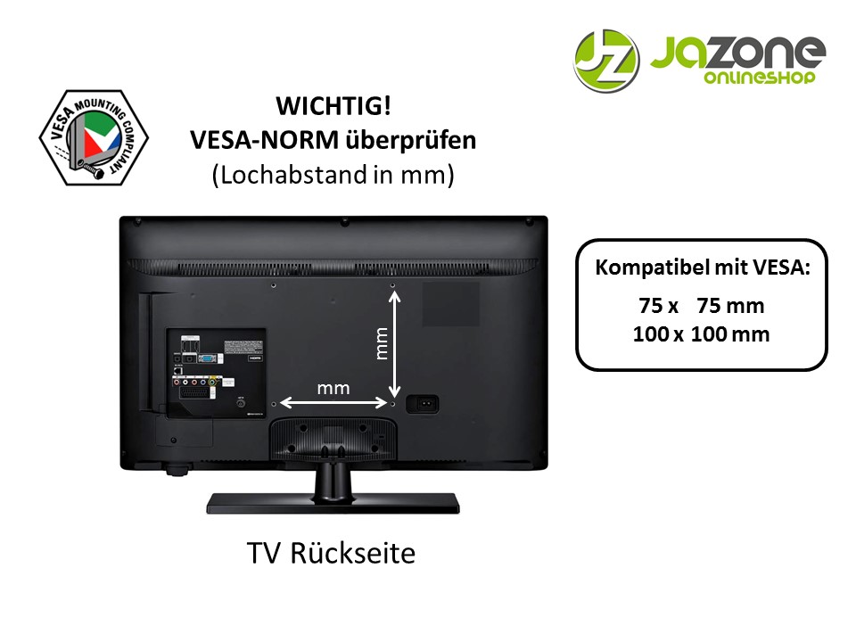 Auf der Rückseite des Fernsehers sind vier Gewindelöcher, die für die Befestigung der TV Halterung vorgesehen sind.Zum Beispiel: VESA 200 x 200 - das bedeutet, dass der Lochabstand zwischen den Gewinden auf der Rückseite des Fernsehers200mm horizontal x 200mm Vertikal beträgt.Passt die VESA-Norm Ihres TV Gerätes zu der Norm der Halterung, dann passt diese Halterung für Ihren Fernseher!