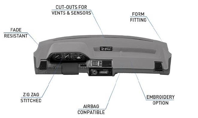 Our beautiful velour dash covers are available in 11 fade-resistant colors. These covers are made to protect against extreme heat from the sun. These covers also reduces glare while driving. Manufactured using three layers of polyester fabric, our velour cover fits perfectly and will hug the contours of your dash. They include all cutouts for airbags, sensors, cup holders and airvents. With our custom fit, you no longer have to compromise the safety of your car by covering any important parts of your dash. Coverking custom-fit dash covers come complete with the exact cutout needed for your Vehicle. Note: Depending on your vehicle's windshield angle, lighter colors may reflect on the inside of the windshield. Coverking recommends darker dash cover colors to avoid this reflection.