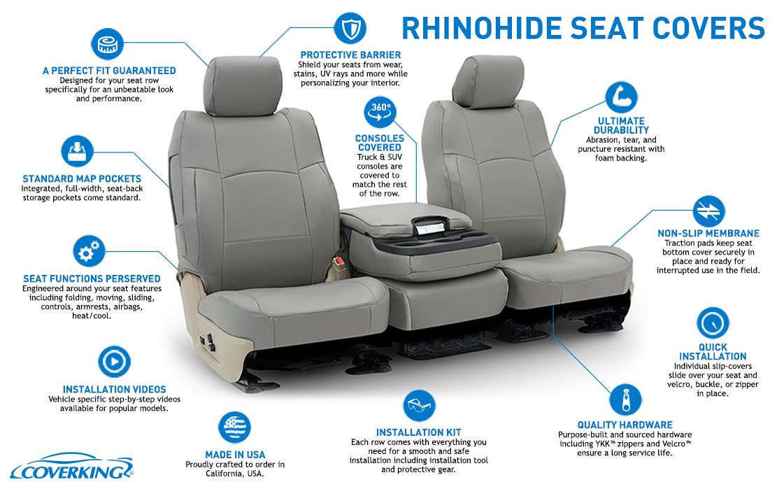 Its name says it all; Rhinohide. Made from PVC, this custom seat cover is the toughest Coverking has ever made. With its leather appearance and texture, the Rhinohide custom seat cover looks amazingly sleek and smooth. Its sheen finish is complimented by the fine craftsmanship and superior stitching of each seam. Each piece is digitally cut to make sure that the finish product fits the exact specification of your vehicle's seats. The cover also is highly water resistant, which means the seat covers can be wiped down without the worry of damaging the material. All seat covers come with applicable consoles (split bench rows only), airbag cutouts and pockets. Also included is a thick layer of form backing for added comfort and protection. The Rhinohide seat covers are made for those looking for the ultimate protection for their vehicle with the elegant look of leather.