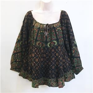 Artsy clothing for creative people who aren't afraid to show a little color! 100% Rayon block print pull over mandala peasant top with drawstring neckline. Loose fit; looks great with jeans. Really nice drape to this item. Block print may look sllightly different from item to item but the top hanging in the separate photo looks more like the ones we have in stock as opposed to the one on the model. Check the measurements below.