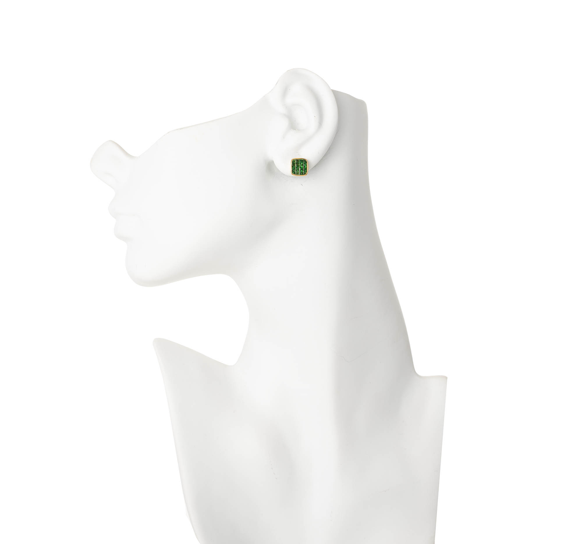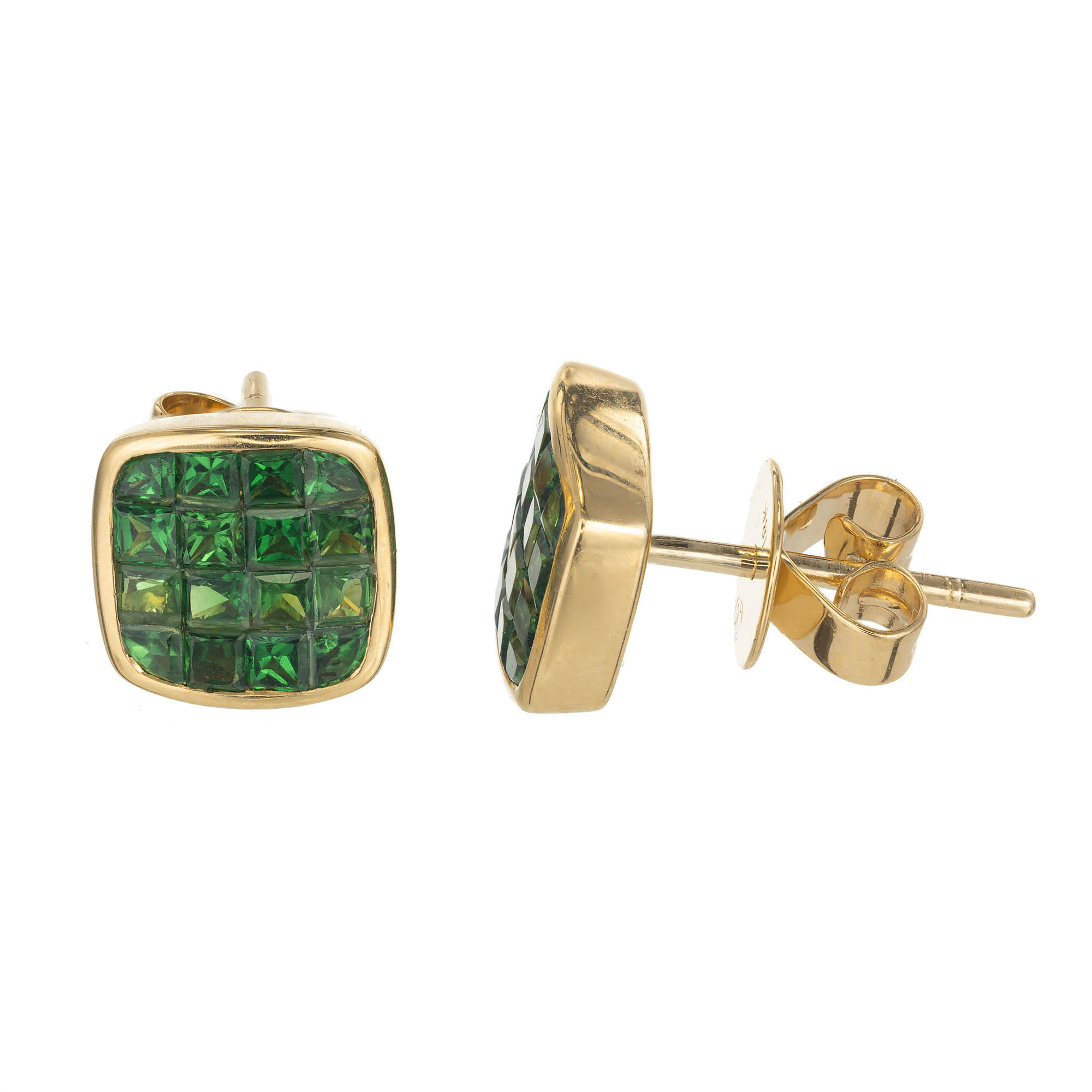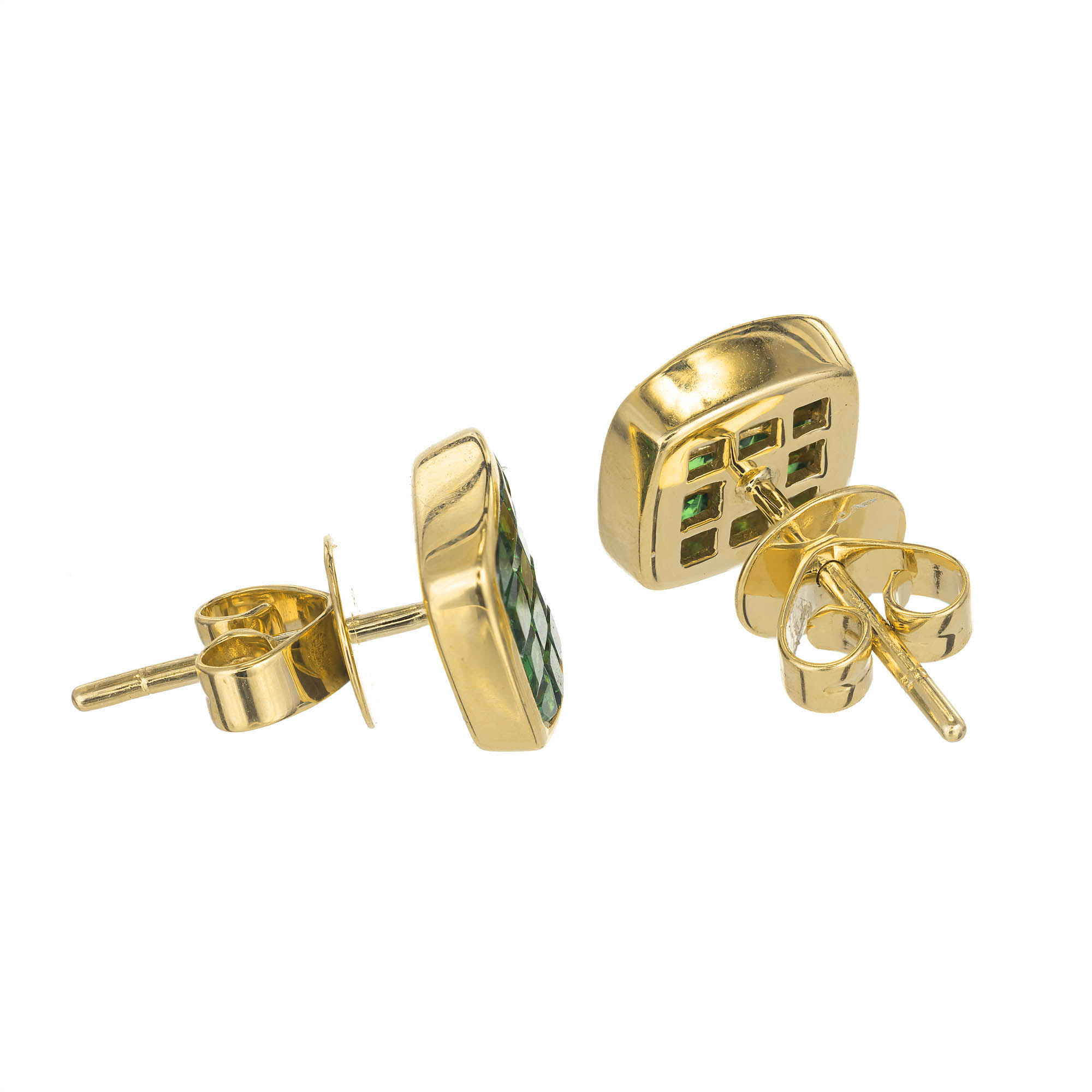 Stunning rare invisibly set bright green square Tsavorite Garnet earrings in 18k gold frames. Excellent condition. Top vivid green color. 32 square Tsavorite Garnets approx. total weight 1.62cts. Stamped 18k. 3.5 grams. 3/8 x 3/8 inch.