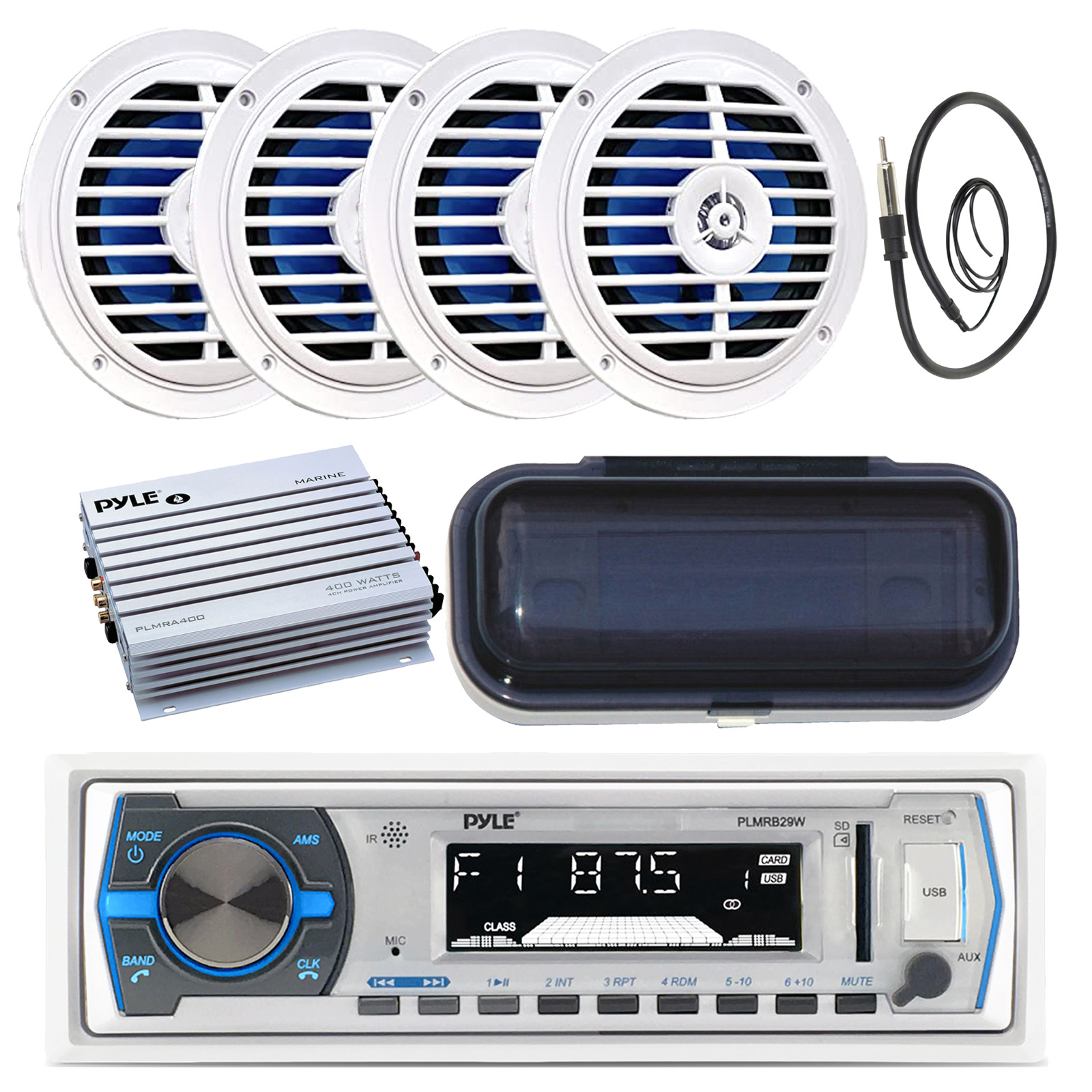 Pyle PLMRB29B Single DIN Bluetooth MP3 In-Dash Stereo Receiver, 4x 5.25" 100 Watt Max Marine Dual Cone Full Range White Speakers, 4-Channel Amplifier, White Radio Cover, 22" Antenna