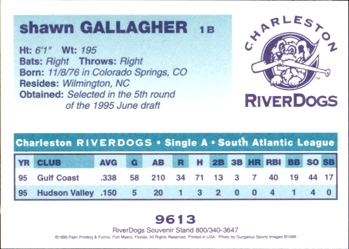 1996 Charleston Riverdogs Team Issue #9613 Shawn Gallagher Wilmington NC Card