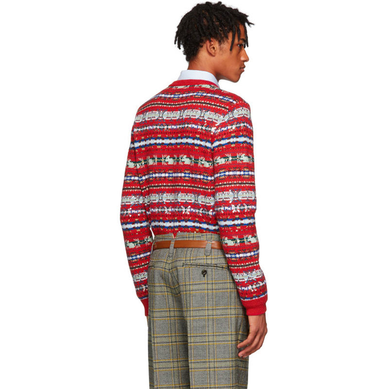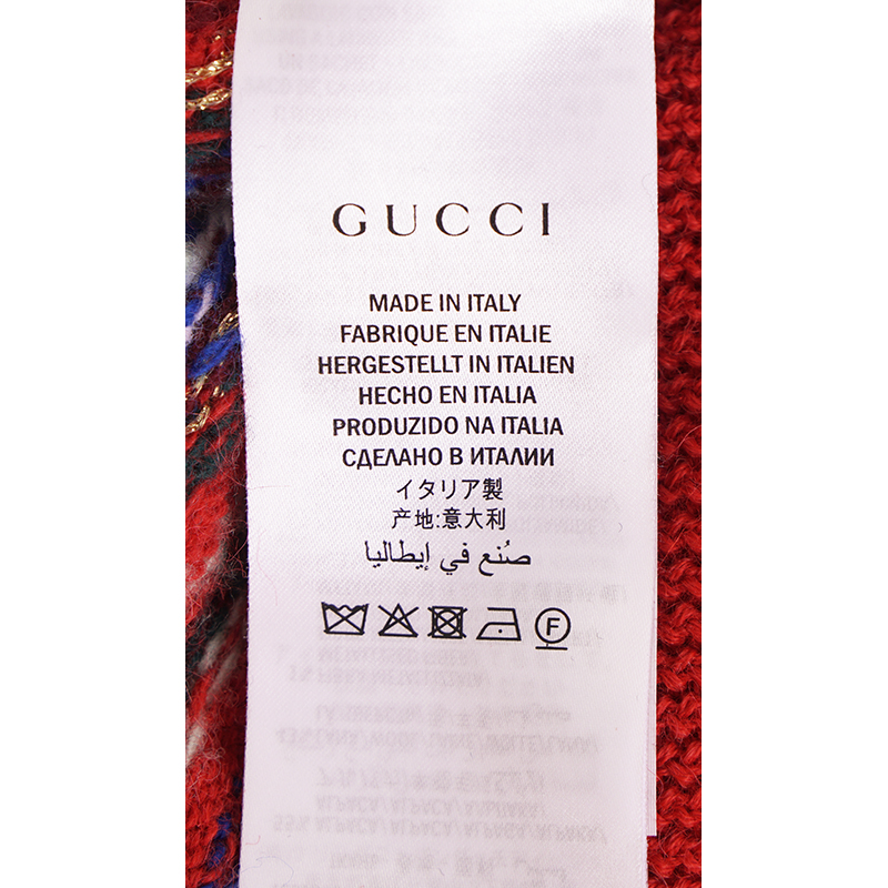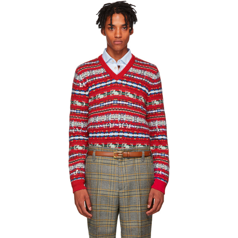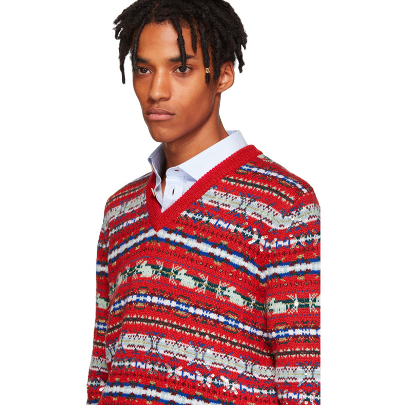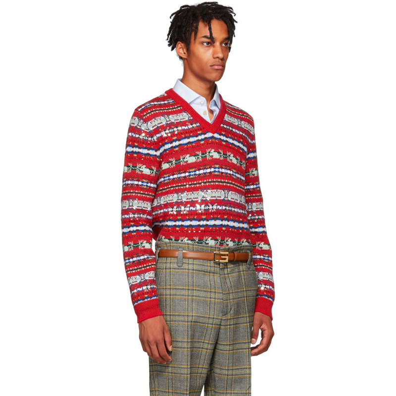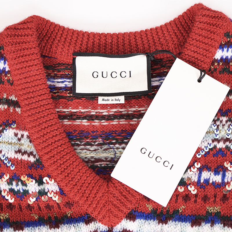 Authentic Gucci sweater in a stunning style. Red alpaca and wool-blend. Multicolor intarsia jacquard knit GG logo, stripes and sequinned detailing throughout. Long sleeve . Rib knit V-neck collar, cuffs, and hem. Made in Italy. Style 536624. Sure to get noticed.