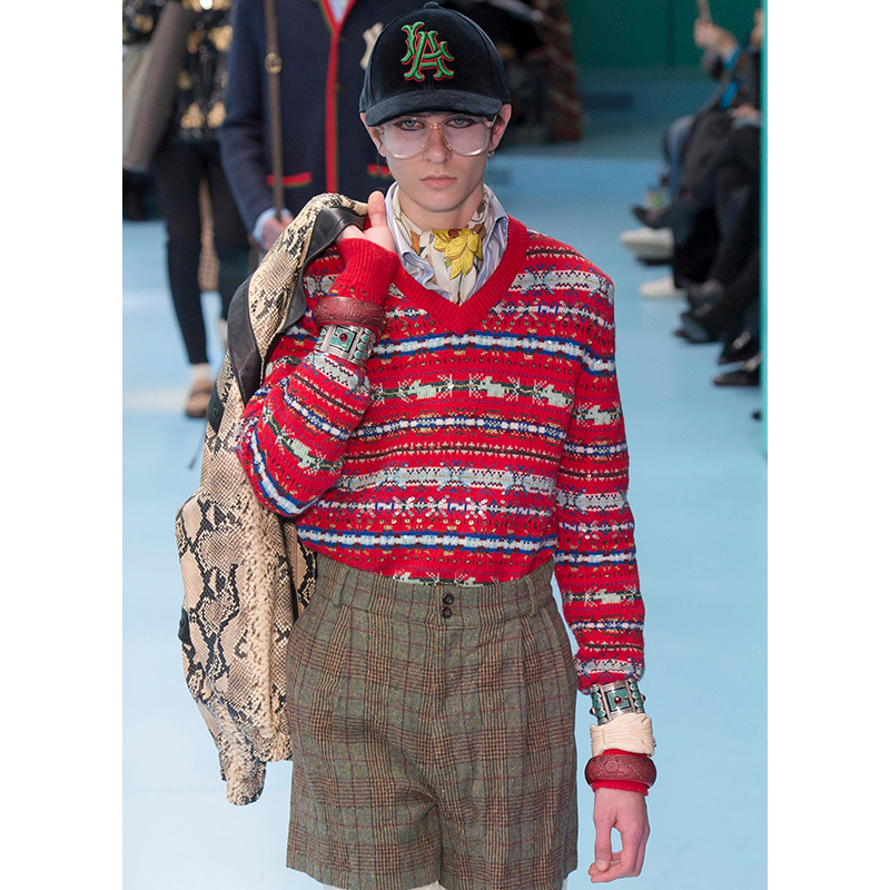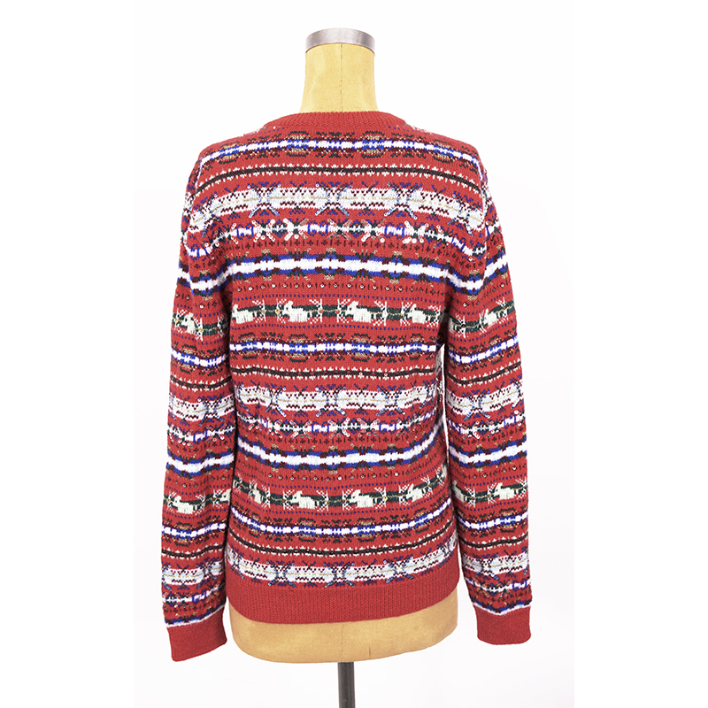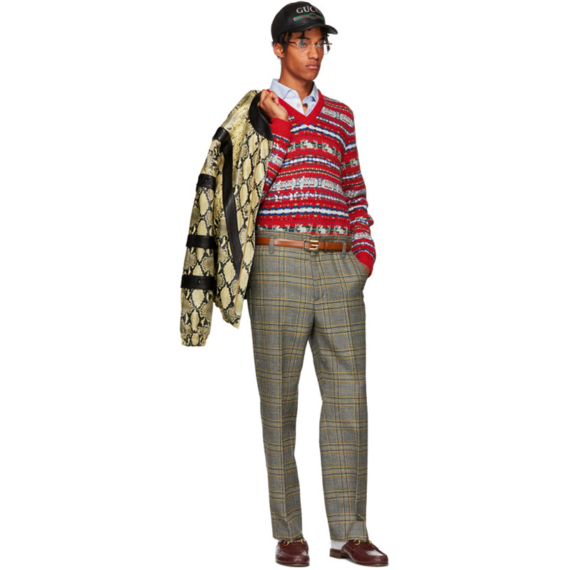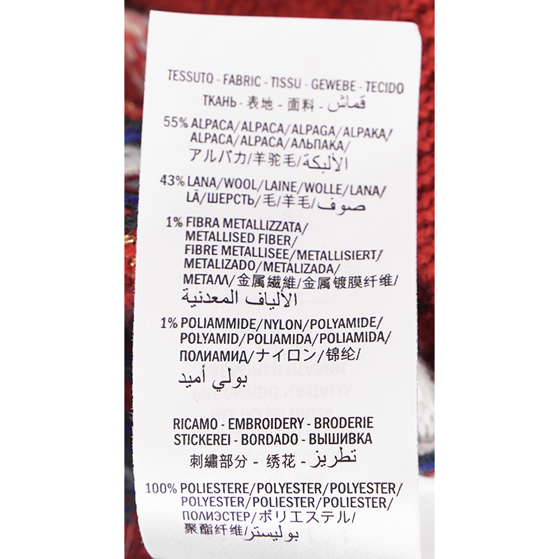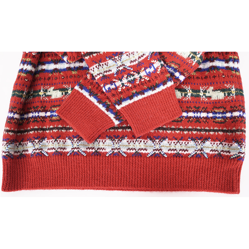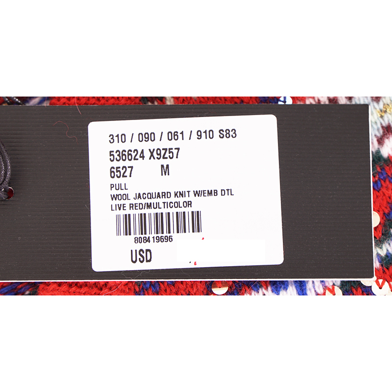 Authentic Gucci sweater in a stunning style. Red alpaca and wool-blend. Multicolor intarsia jacquard knit GG logo, stripes and sequinned detailing throughout. Long sleeve . Rib knit V-neck collar, cuffs, and hem. Made in Italy. Style 536624. Sure to get noticed.