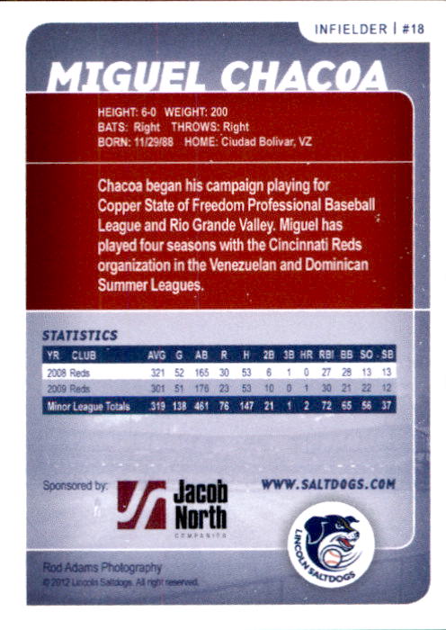 2012 Lincoln Saltdogs Team Issue #2 Miguel Chacoa Bolivar Venezuela VZ Card
