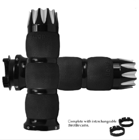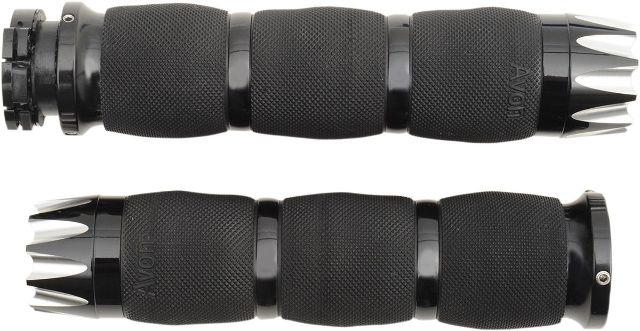 "Air Ride For Your Hands!" The Avon Air Cushion Black Anodized grips feel great and are very functional too. Manufactured in the USA with a special core bar that creates air pockets inside the grip body. These air pockets dampen vibrations, help eliminate the tingle in your hands and soften the overall feel of the ride. The soft serrated texture on the grip surface helps you hold on to your bike with no-slip confidence. The grips are finished off with only the best - 6061 billet aluminum end caps and collars.