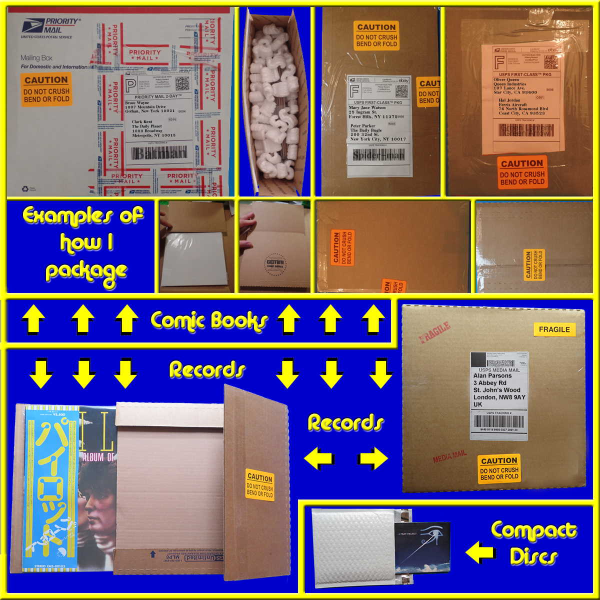 I have a reputation for solid packaging to protect your item from the postal worker's pet gorilla in case he decides to stomp. Rest assured, I will do my part to ensure your item will arrive safe. For US sales, delivery confirmation is included. If this item doesn't have free shipping, use the calculator for US shipping/handling costs. Regarding shipping CDs, I can't guarantee that the post office will not be rough and a CD case get a crack in it during shipment. This is USA shipping only unless there are shipping costs listed for your country or it says contact seller for costs. Comic book sales are generally USA only. I