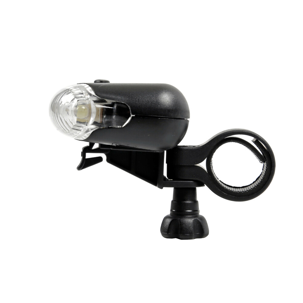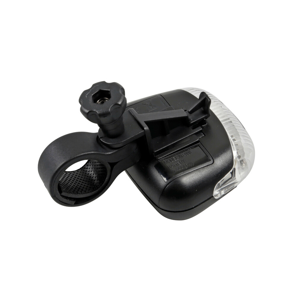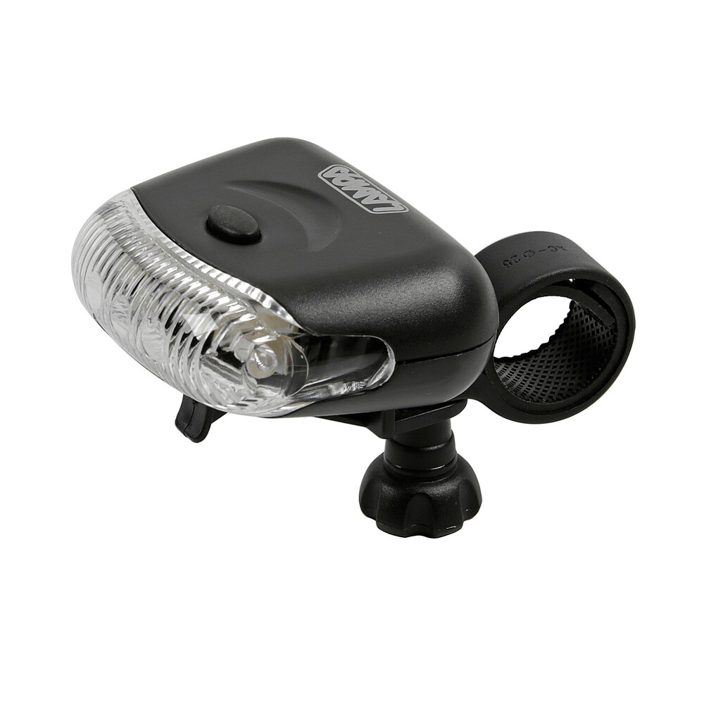 Fanale anteriore 3 Led. 3 funzioni: luce fissa, lampeggiante, lampeggiante rapido. Staffa di fissaggio a innesto e disinnesto rapido. Funzionamento a batterie (non fornite)