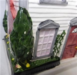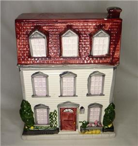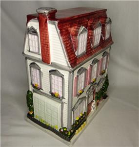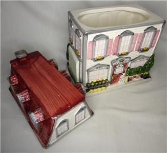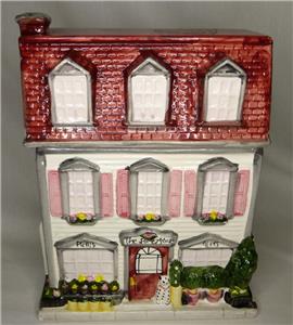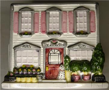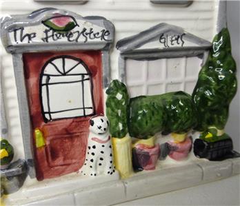 This adorable Flower Shop cookie jar is from Sherwood Brand. The three-story building has white bricks with shuttered windows, window boxes, flowers and shrubbery and a chimney the red roof. The storefront has a sign above the door The Flower Store with a white and black Dalmatian puppy ready to welcome you. The windows on either side of the door proclaim Plants and Gifts.