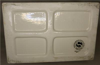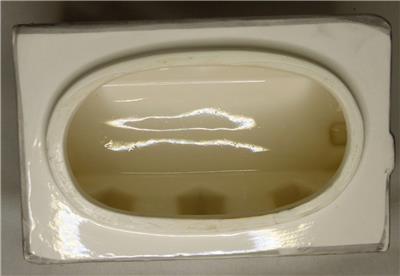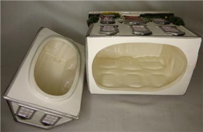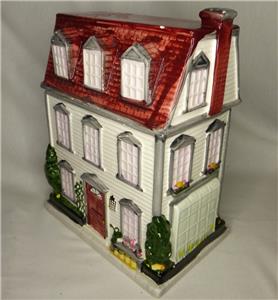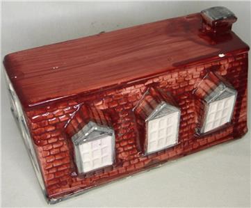 The total shop cookie jar measures almost 10” tall with the roof on, 6” without roof, x 7 ½” wide x 5” deep. The bottom has a stamp that reads Sherwood Brands Inc. Rockville MD 20852 around the logo S, Made in China, 1999 copyright. The cookie jar in in good structural condition, but there are tiny chips throughout that could be easily touched up if so desired.
